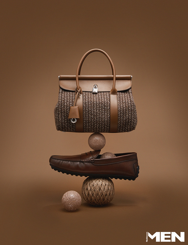 셰브런 패턴의 페코라 네라Ⓡ 울 소재가 포근한 촉감을 선사하는 룸 L25 백 Loro Piana, 은은한 광택과 그러데이션이 중후한 매력을 완성한다. 시티 고미노 드라이빙 슈즈 Tod’s.
