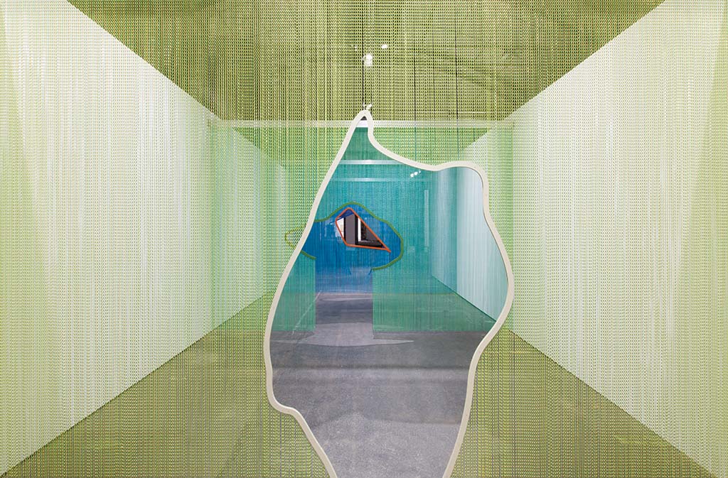 전시는 입구에 들어서는 순간부터 감각을 일깨운다. 3개 이상의 방향으로 열려 있는 사선 형태의 파티션은 관람객이 전체 공간을 한눈에 파악하지 못하도록 혼돈을 안긴다. 그 순간부터 숲속 오솔길을 걷는 듯한 착각을 불러일으킨다. 이어지는 공간에서는 작가의 대표작인 알루미늄 커튼이 관람객을 맞이한다. 통로를 막은 것인지, 혹은 지나가도록 유도하는 것인지 분간하기 어려운 이 경계는 자연 역시 명확한 경계 없이 다층적으로 다가온다는 사실을 상기시킨다. 관람하는 이는 구조물 사이를 자연스럽게 오가며 공간과 교감하고, 숲속을 거니는 듯한 감각을 체험하게 된다.