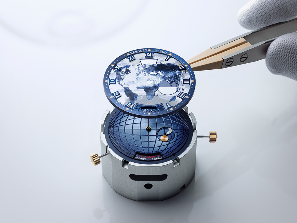 창립 250주년을 맞은 브레게가 다섯 번째 기념작 ‘마린 오라문디 5555’를 통해 또 한 번 브랜드의 정수를 드러낸다. 기존 마린 오라문디 컬렉션을 바탕으로 한 이번 모델은 다이얼에 새로운 미학을 입혔다. 영감은 나사(NASA)가 촬영한 지구의 야간 영상 ‘블랙 마블’에서 비롯됐다. 우주에서 바라본 지구의 밤을 고스란히 옮겨온 듯한 풍경이 다이얼 위에 펼쳐진다. 다이얼 베이스는 자오선과 위선을 따라 기요셰 처리했으며, 그 위에 반투명 사파이어 크리스털 다이얼을 얹었다. 사파이어 다이얼은 3단계에 걸쳐 수작업으로 페인팅했다. 뒷면에는 대륙을, 앞면에는 구름을 에나멜 페인팅으로 구현한 뒤 고온 가마에 구워 입체감과 깊이를 더했다. 여기에 특허출원 중인 인광 에나멜 기술을 적용해 밤의 빛을 은은하게 표현했다. 전 세계 50점 한정 생산하며, 국내 출시 가격은 약 1억 4302만 원.
