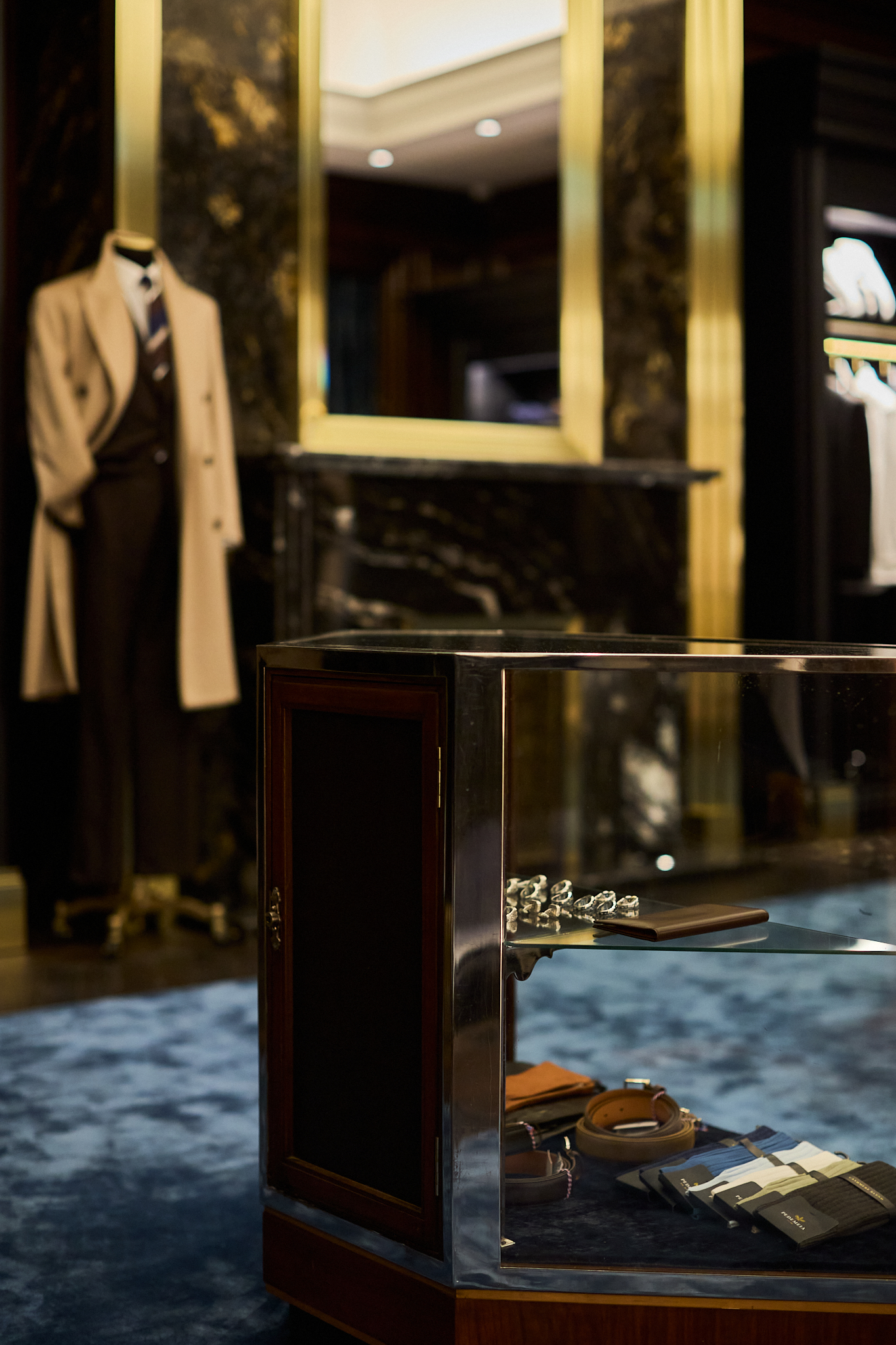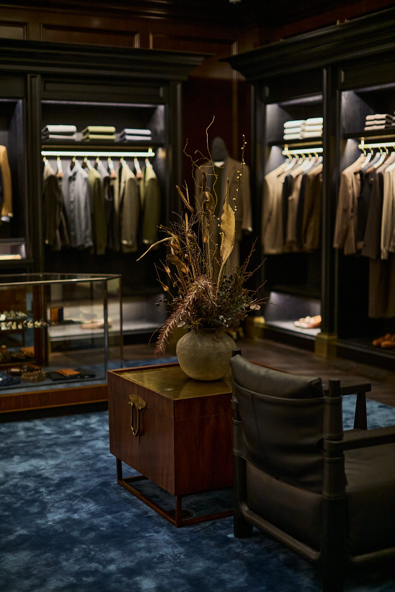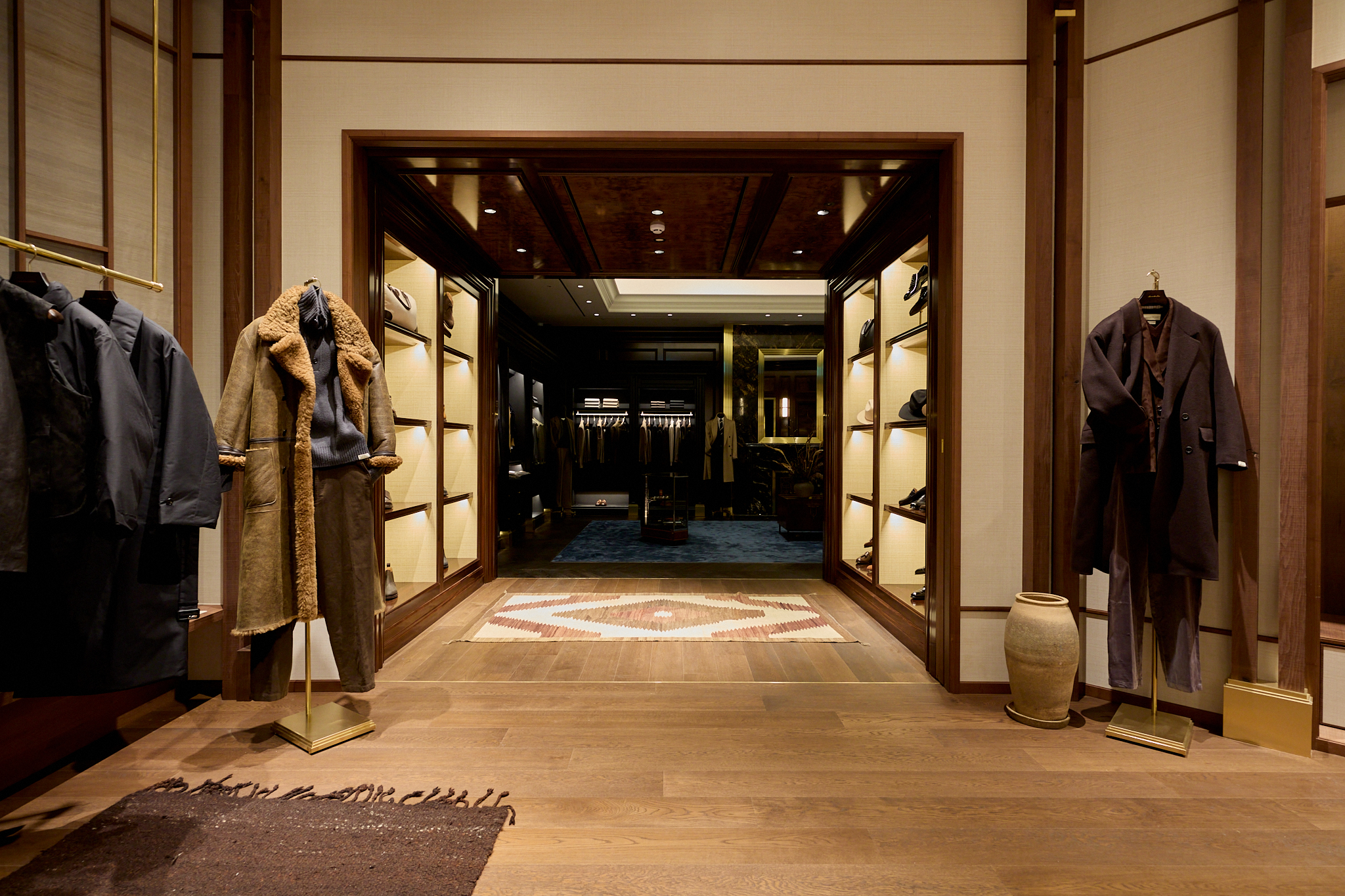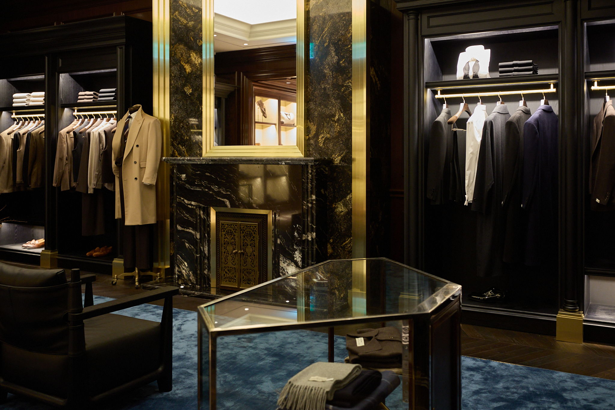 마지막으로 도달하는 포멀 존(Formal Zone)은 실크, 벨벳, 벌 우드, 대리석 벽난로 등 고급 소재로 완성되어 브랜드의 취향을 가장 깊이 있게 체감할 수 있는 공간이다. 맨온더분을 비롯한 다양한 브랜드의 포멀 라인과 테일러링 컬렉션이 진열되어 있으며, 브랜드가 궁극적으로 추구하는 테일러링의 정점과 남성미에 대한 해석을 가장 명징하게 보여준다.