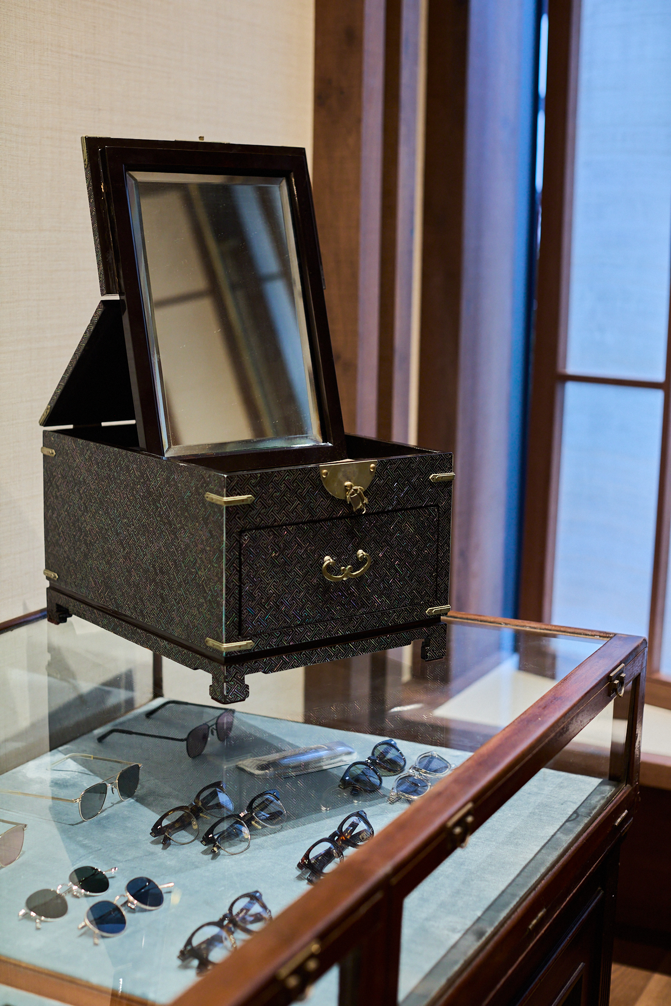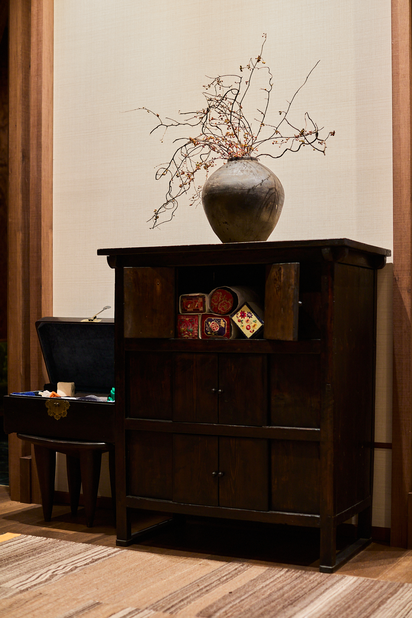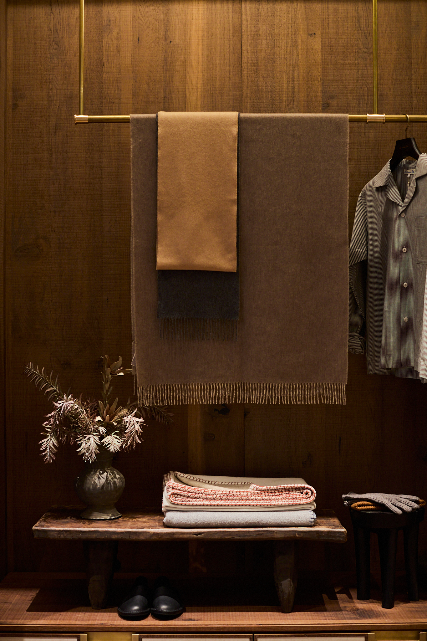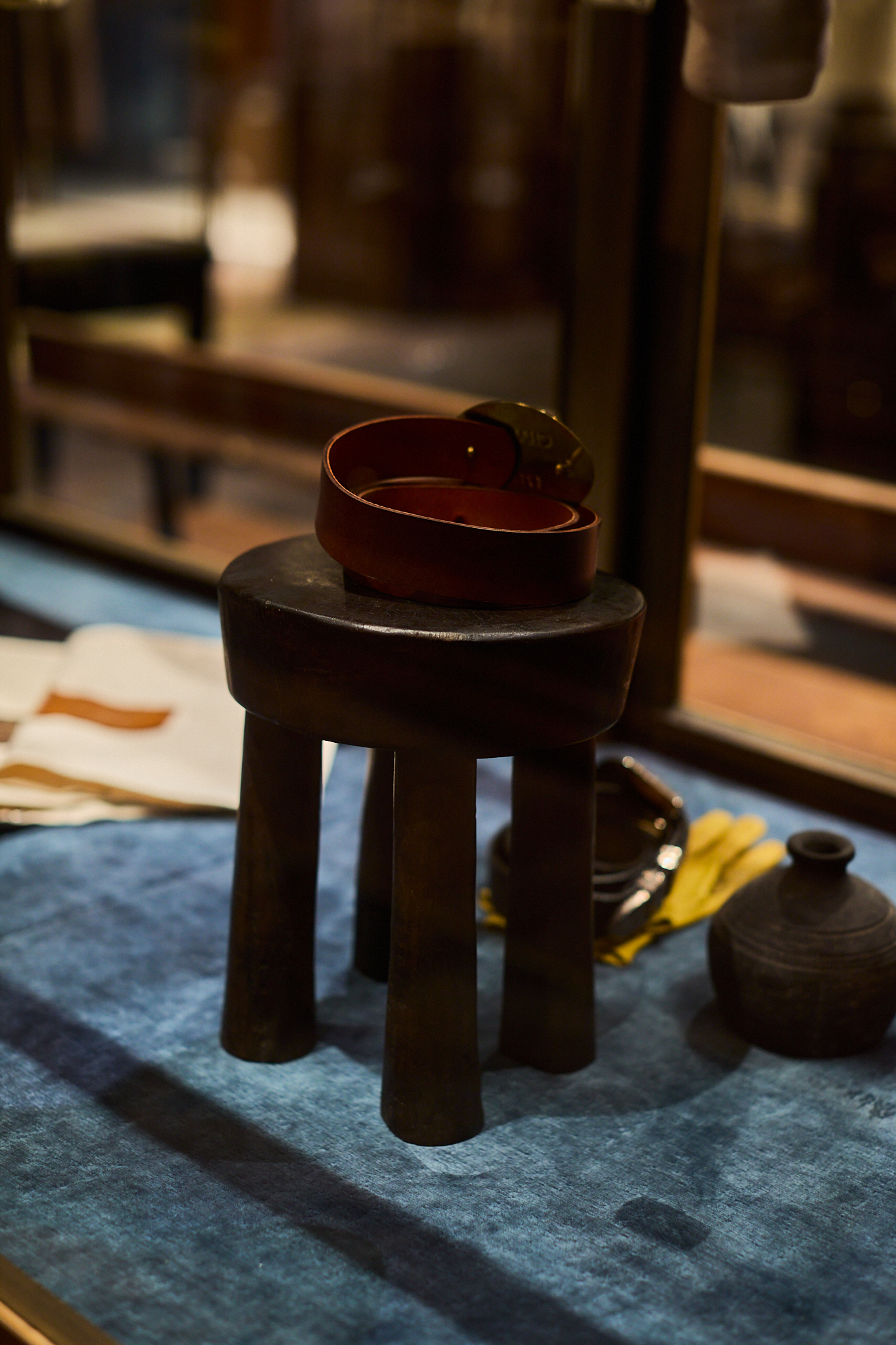 맨온더분 청담은 제품뿐만 아니라 매장 곳곳을 채운 가구와 오브제 또한 인상적이다. 한국 패브릭 공예가 김수연 작가의 조각보 패치워크 작품과 더불어 돈궤, 관복함, 깨뒤주 등 한국 전통 고가구들이 공간을 채운다. 여기에 아프리칸 스툴과 빈티지 카페트가 자연스럽게 조화를 이루며, 시대와 문화가 교차하는 맨온더분만의 독보적인 분위기를 완성한다.