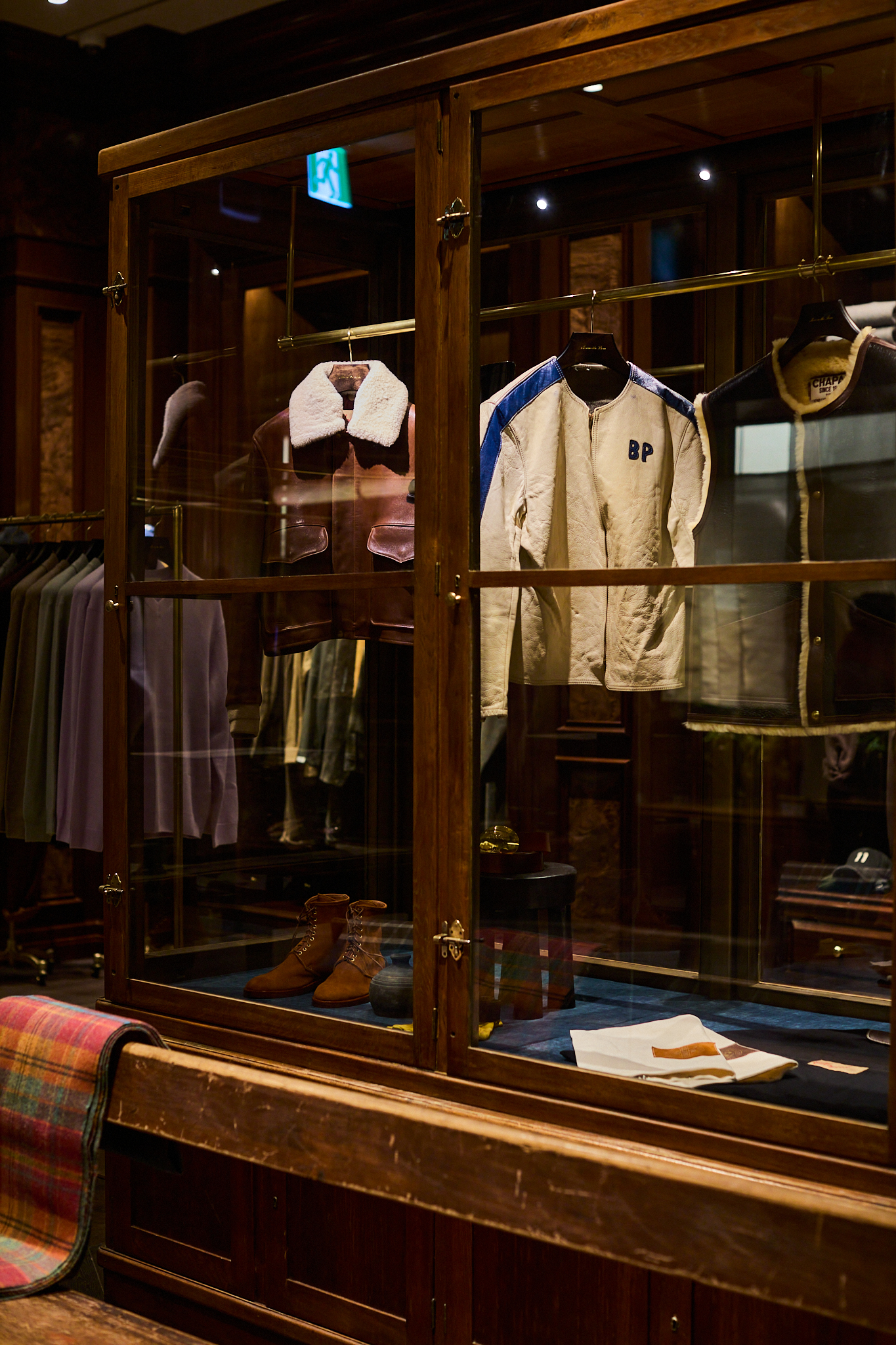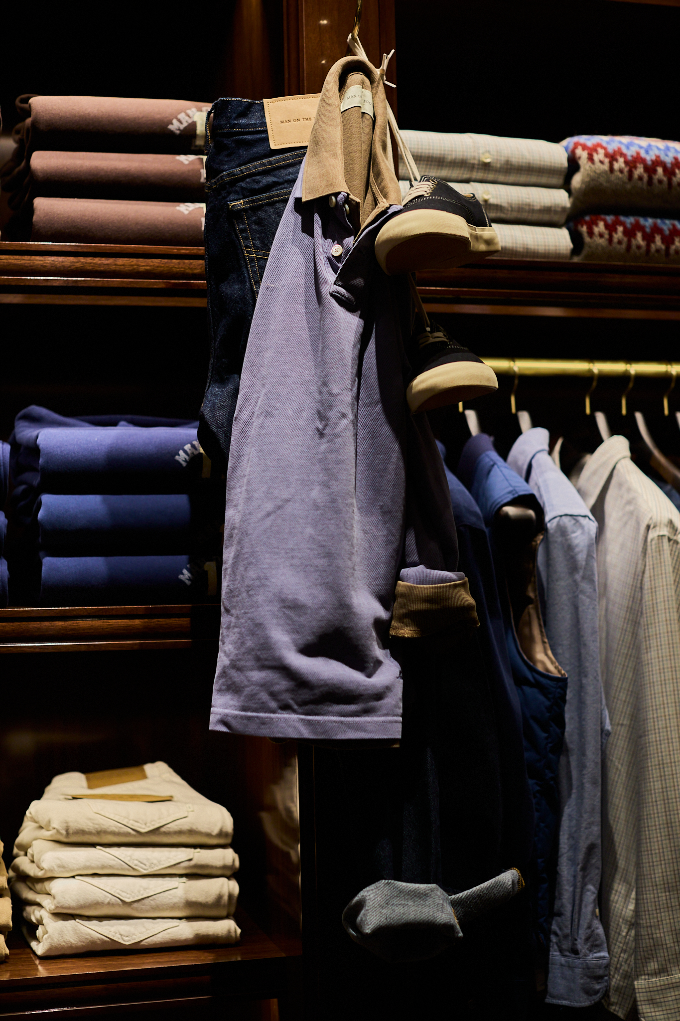 매장 입구를 들어서면, 가장 먼저 캐주얼 존(Casual Zone)이 펼쳐진다. 한국식 양옥의 고풍스러운 목조 디테일과 버얼 우드(Burl Wood) 소재를 중심으로 공간을 구성해 맨온더분 청담만의 정체성을 드러낸다. 거대한 응접실을 연상시키는 고가구와 빈티지 진열장이 배치돼 아메리칸 클래식의 감성을 은은하게 더한다. 이 공간에서는 맨온더분의 새로운 캐주얼 라인과 청담점 익스클루시브 하이엔드 프렌치 레더 브랜드 샤팔(Chapal)을 비롯한 여러 브랜드의 셀렉션을 만날 수 있다.