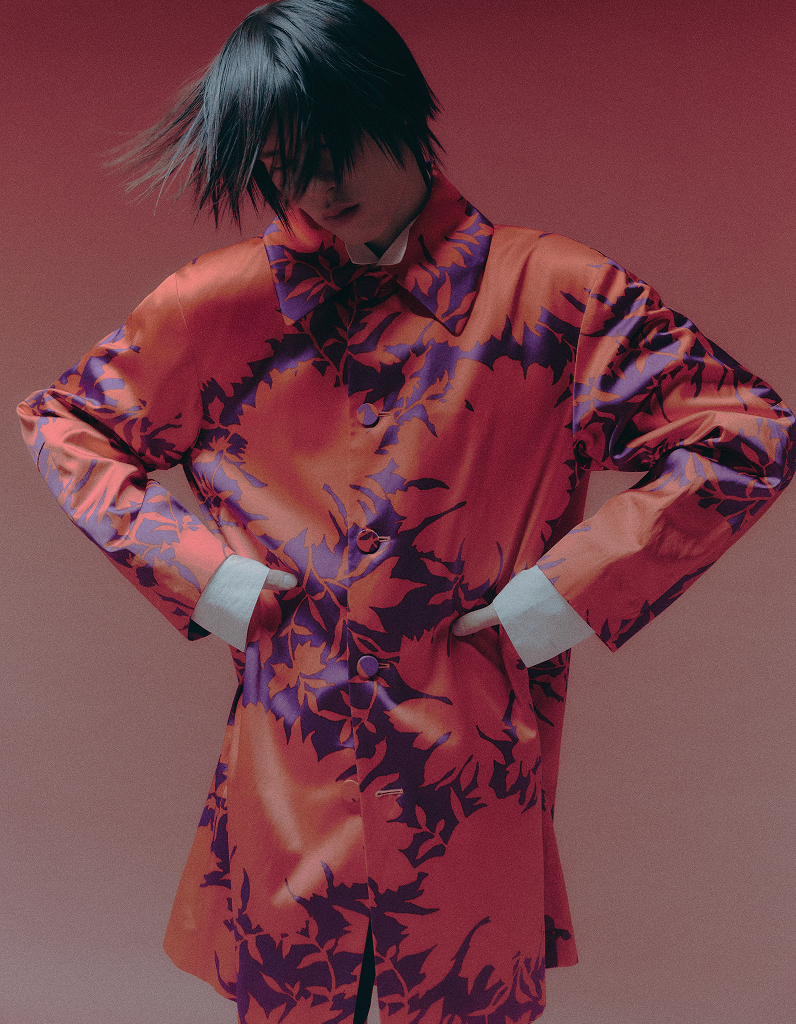 플라워 패턴 싱글 코트와 화이트 셔츠 모두 Dries Van Noten.