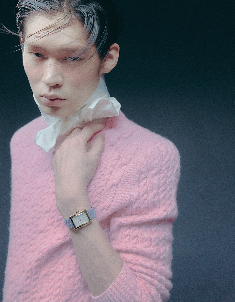 케이블 짜임의 맨 니트 톱, 리본 장식 맨 넥밴드 모두 Dior, 18K 베이지 골드 케이스에 퀼팅 패턴 블루 스트랩을 적용한 보이·프렌드 워치 Chanel Watches.