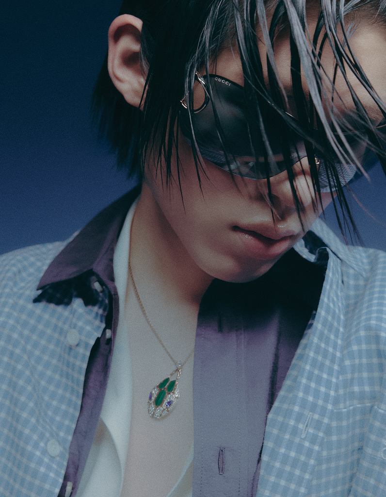 블루 선글라스 Gucci by Kering Eyewear, 블루 사파이어와 말라카이트, 다이아몬드로 뱀 얼굴을 형상화한 세르펜티 세두토리 네크리스 Bvlgari.