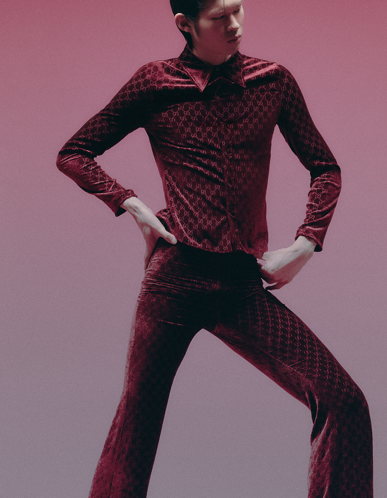 버건디 벨벳 셔츠와 팬츠 모두 Gucci by Demna.