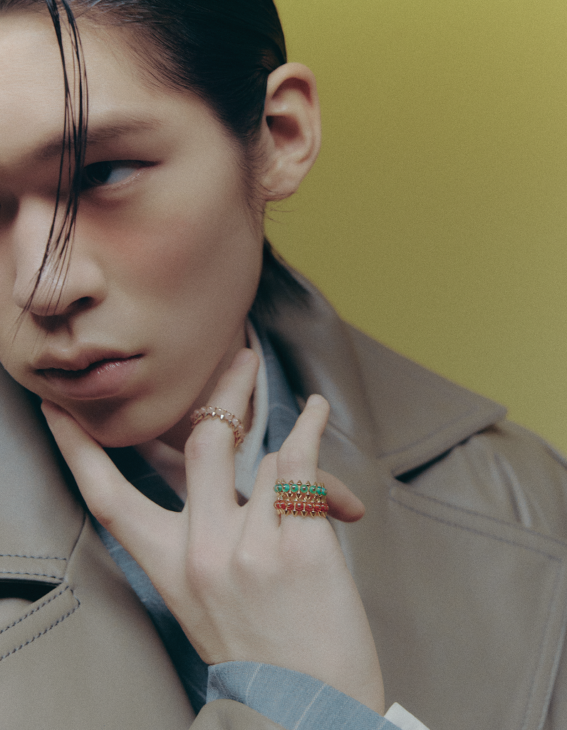 그레이 레더 트렌치코트와 핀스트라이프 재킷, 화이트 셔츠 모두 Bottega Veneta, 핑크 캘세더니와 그린·레드 아게이트를 각각 장식한