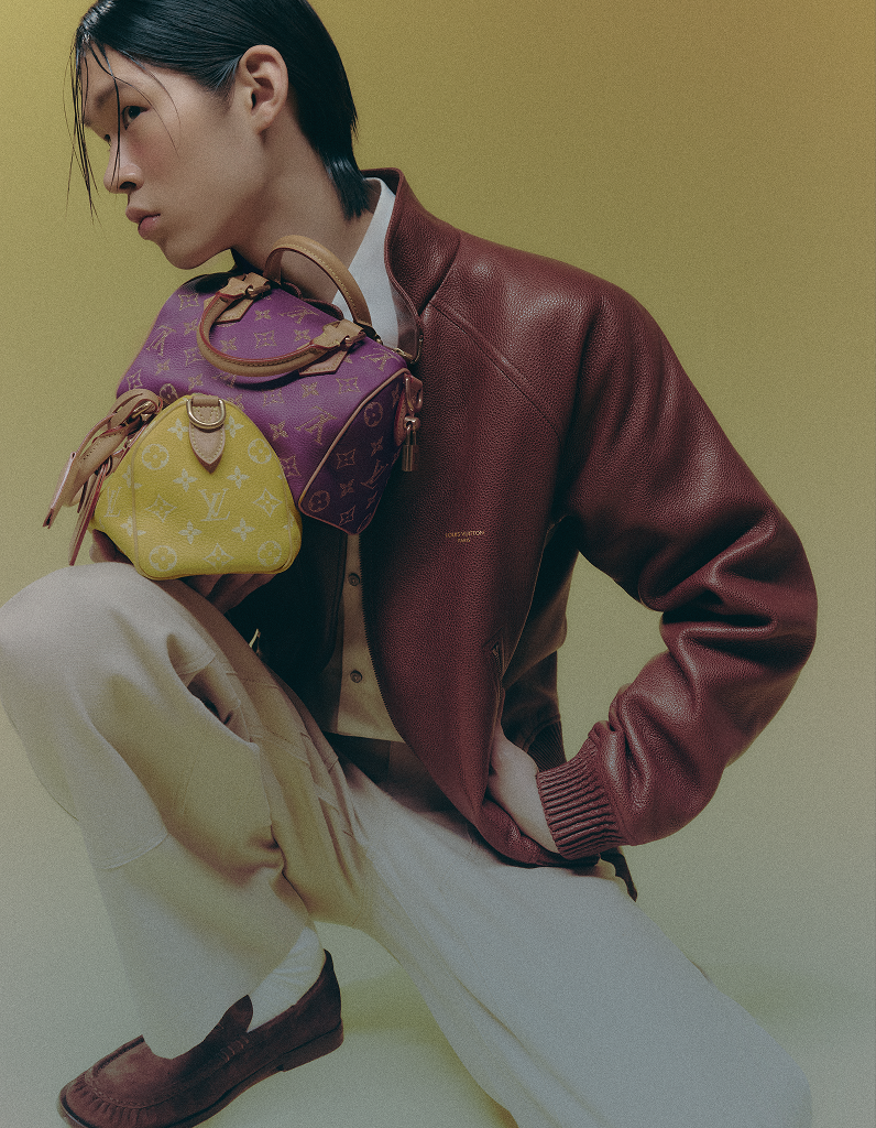 버건디 레더 블루종과 화이트 셔츠, 치노 팬츠, 브라운 로퍼, 퍼플 스피디 P9 반둘리에 20 백, 옐로 스피디 P9 반둘리에 20 백 모두 Louis Vuitton, 양말 스타일리스트 소장품.