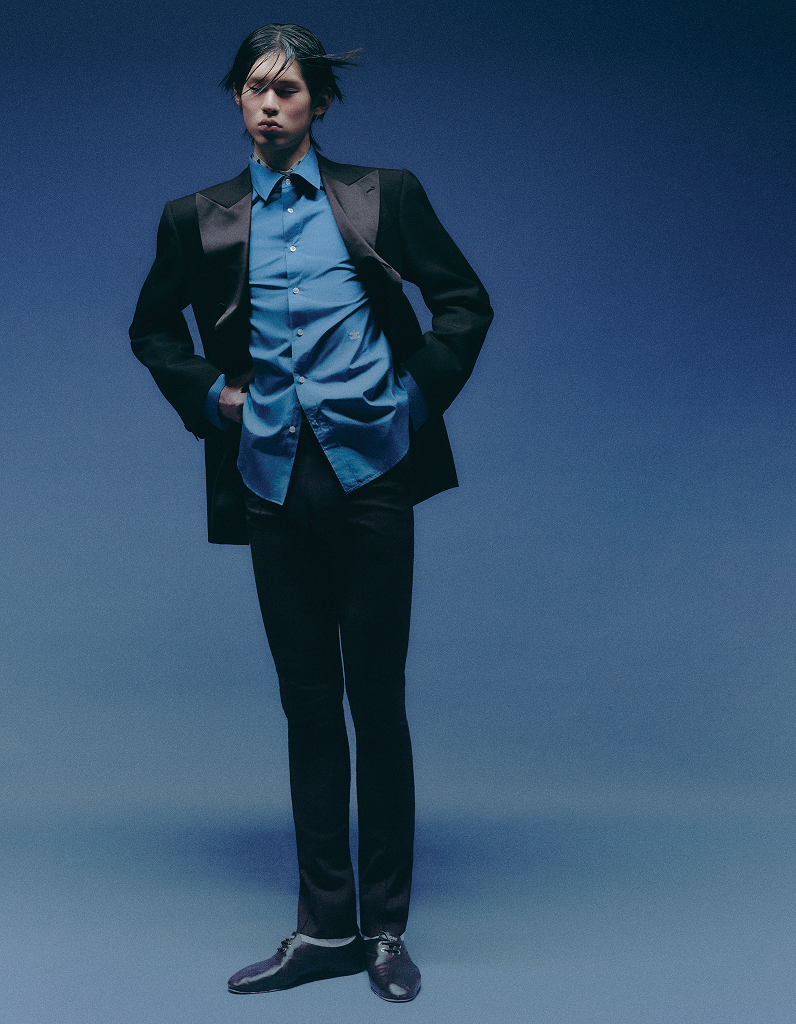 블랙 턱시도 재킷과 블루 셔츠, 슬림 팬츠, 레이스업 슈즈, 실크 스카프 모두 Celine, 양말 스타일리스트 소장품.