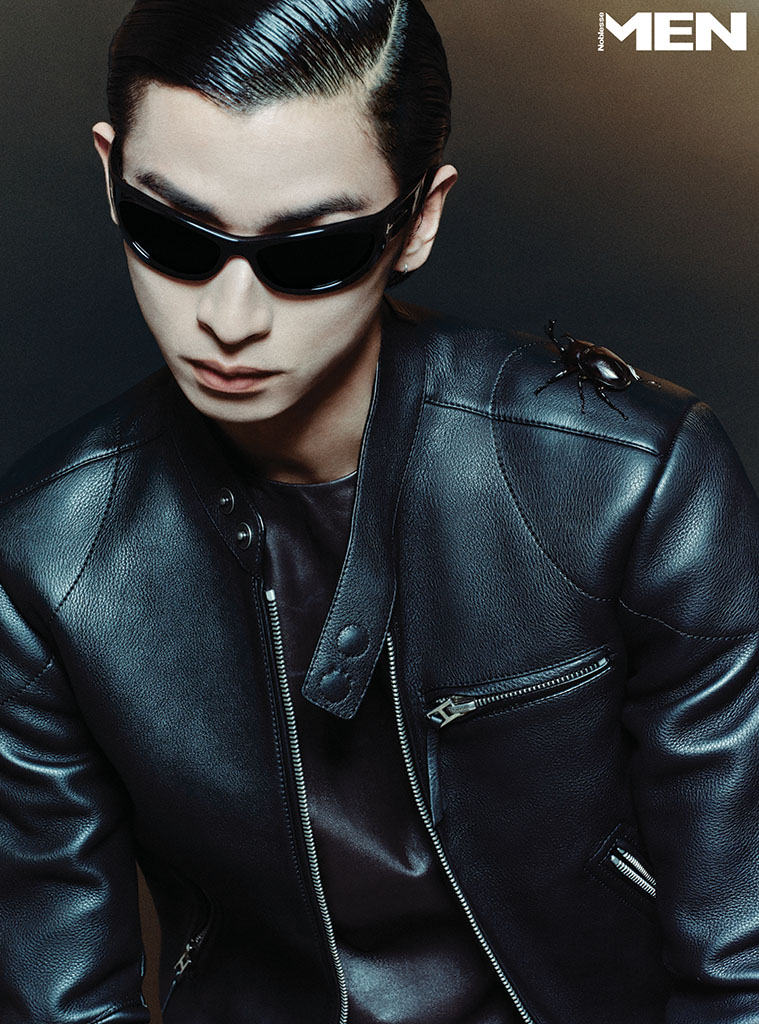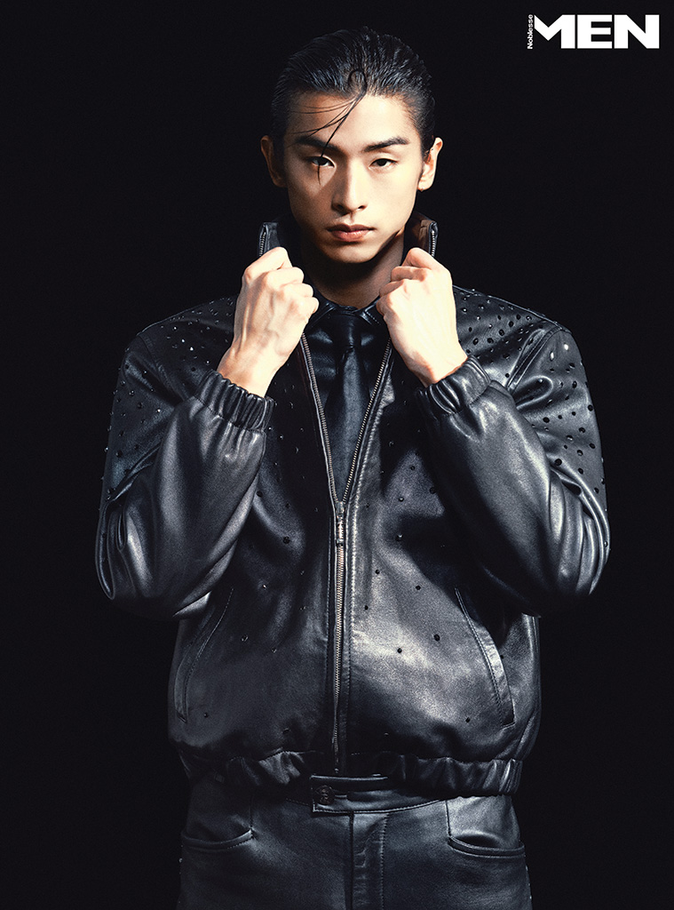 스와로브스키 크리스털 장식 가죽 블루종, 블랙 가죽 셔츠, 타이, 가죽 팬츠 모두 Ernest W. Baker by 10 Corso Como Seoul.