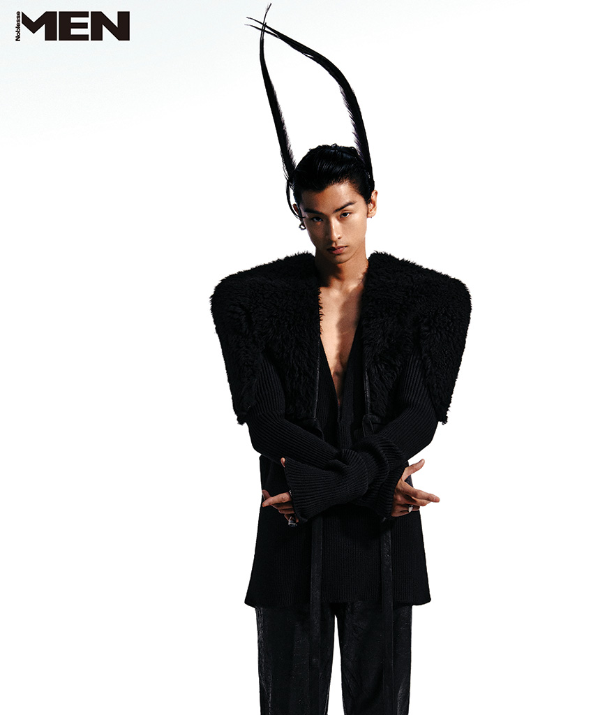 블랙 퍼 재킷과 니트 민소매 티셔츠, 가죽 팬츠 모두 Rick Owens, 깃털 헤어피스 Q Millinery, 이어 커프와 반지 모두 스타일리스트 소장품.