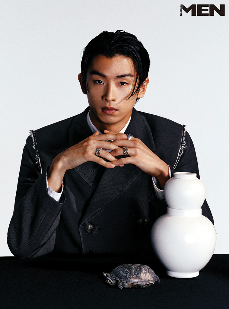 더블브레스트 코트와 화이트 셔츠 모두 Maison Margiela, 오닉스 장식 실버 시그넷 링, 실버 링크 반지 2개 모두 Tom Wood.