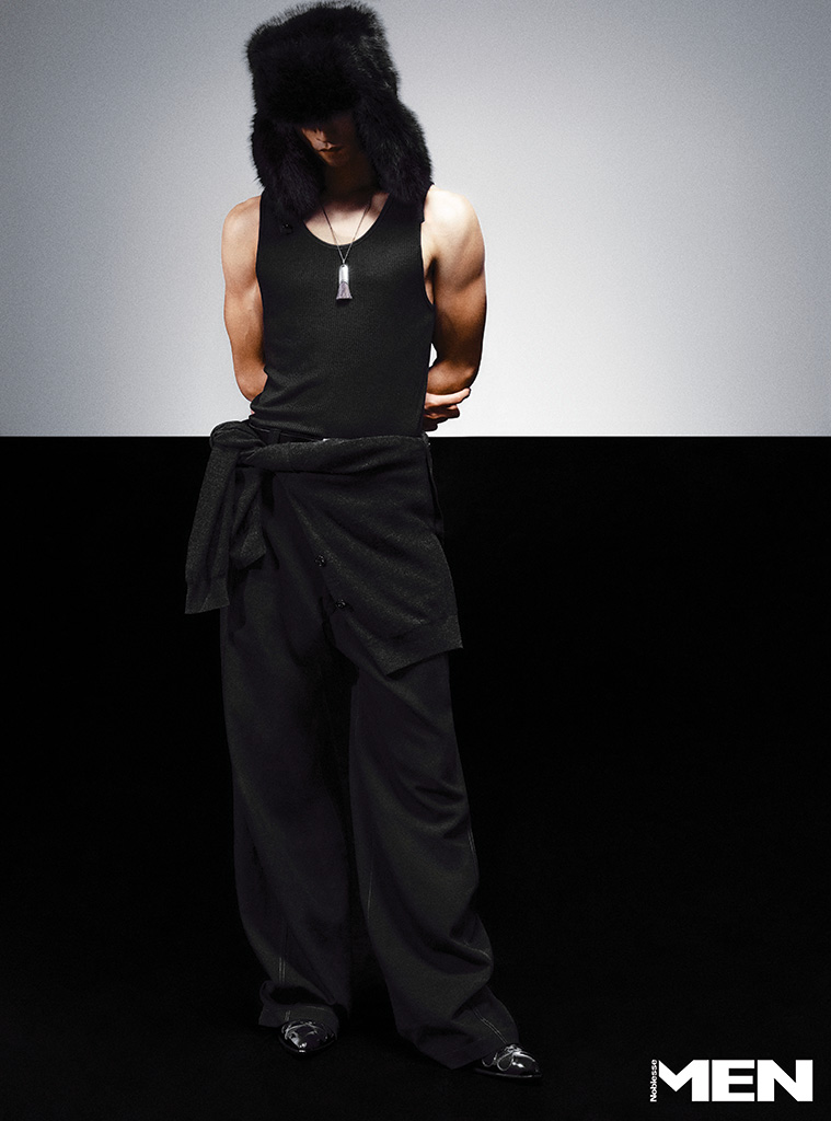 블랙 민소매 톱과 블랙 팬츠, 허리에 두른 카디건, 브러시 펜던트 네크리스 모두 Lemaire, 페이크 퍼 트루퍼 해트 Q Millinery, 블랙 로퍼 Christian Louboutin.