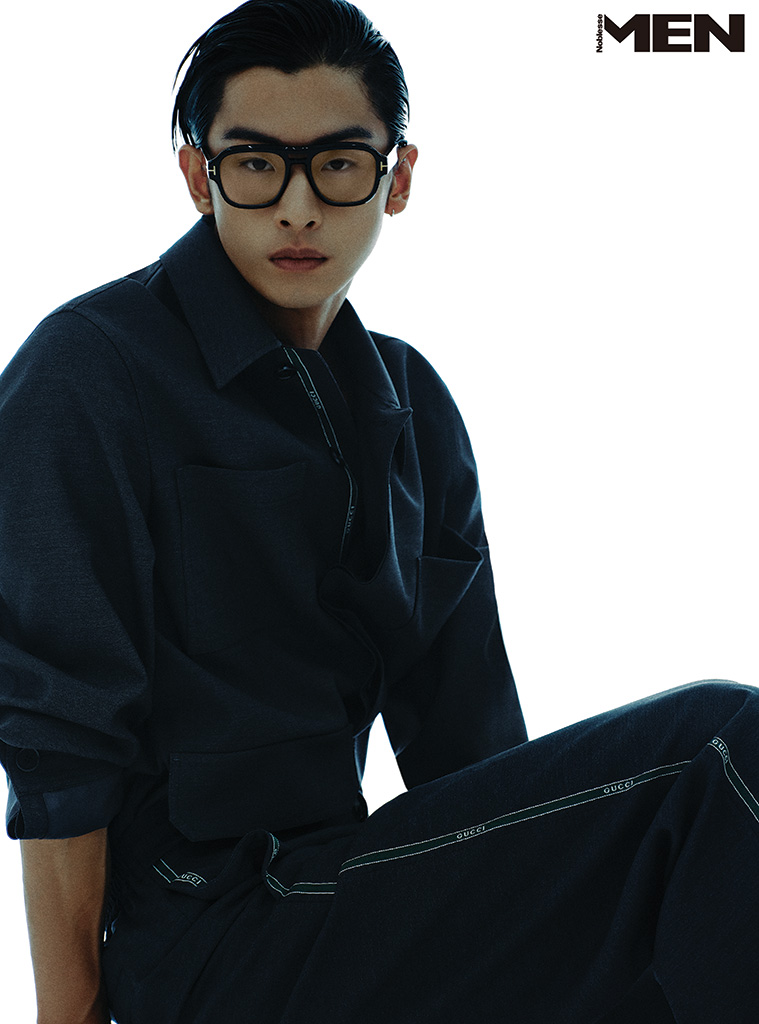 셔츠형 재킷과 팬츠 모두 Gucci, 뿔테 안경 Tom Ford.