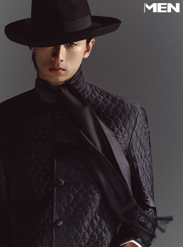 실크 & 캐시미어 혼방 재킷과 베스트, 실크 스카프, 블랙 페도라 모두 Loro Piana.
