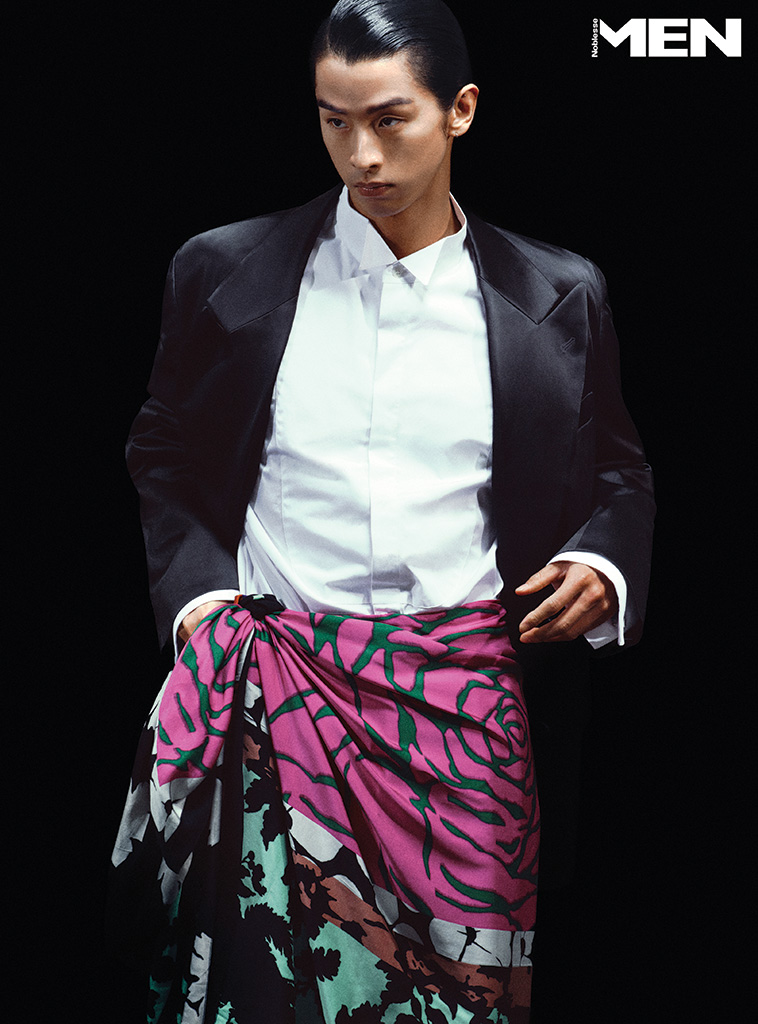 블랙 재킷과 화이트 셔츠, 스카프, 팬츠 모두 Dries Van Noten.
