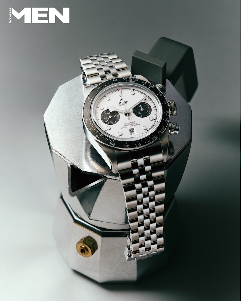 튜더의 크로노그래프 출시 50주년을 맞아 선보인 블랙 베이 크로노. 기존에 없었던 T-fit 클라스프를 장착한 사진 속 5열 링크 브레이슬릿과 3열 리벳 브레이슬릿으로 선택의 폭을 넓혔다. 지름 41mm 케이스에 매트 블랙 알루미늄 인서트를 더하고, 스포츠 크로노그래프의 전통에 따라 오팔린 다이얼 위에 대비되는 2개의 서브 카운터를 배치했다. 3시 방향의 45분 카운터와 9시 방향의 스몰 세컨드, 6시 방향 날짜 창이 균형을 이룬다. 칼럼 휠과 수직 클러치 구조를 갖췄으며, 약 70시간의 파워리저브와 COSC 인증을 확보한 자체 제작 칼리버 MT5813을 탑재했다. Tudor.