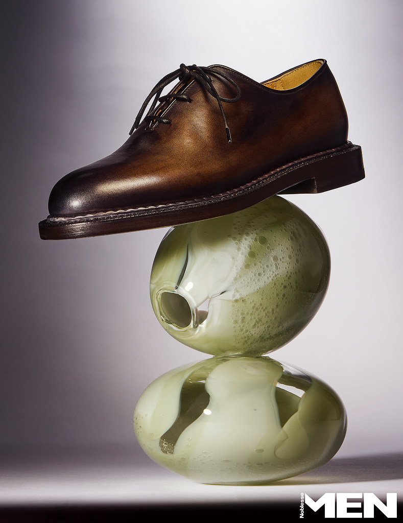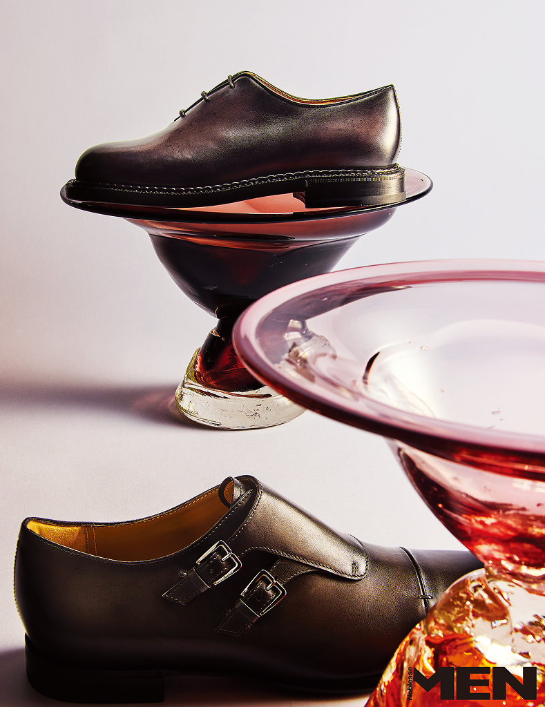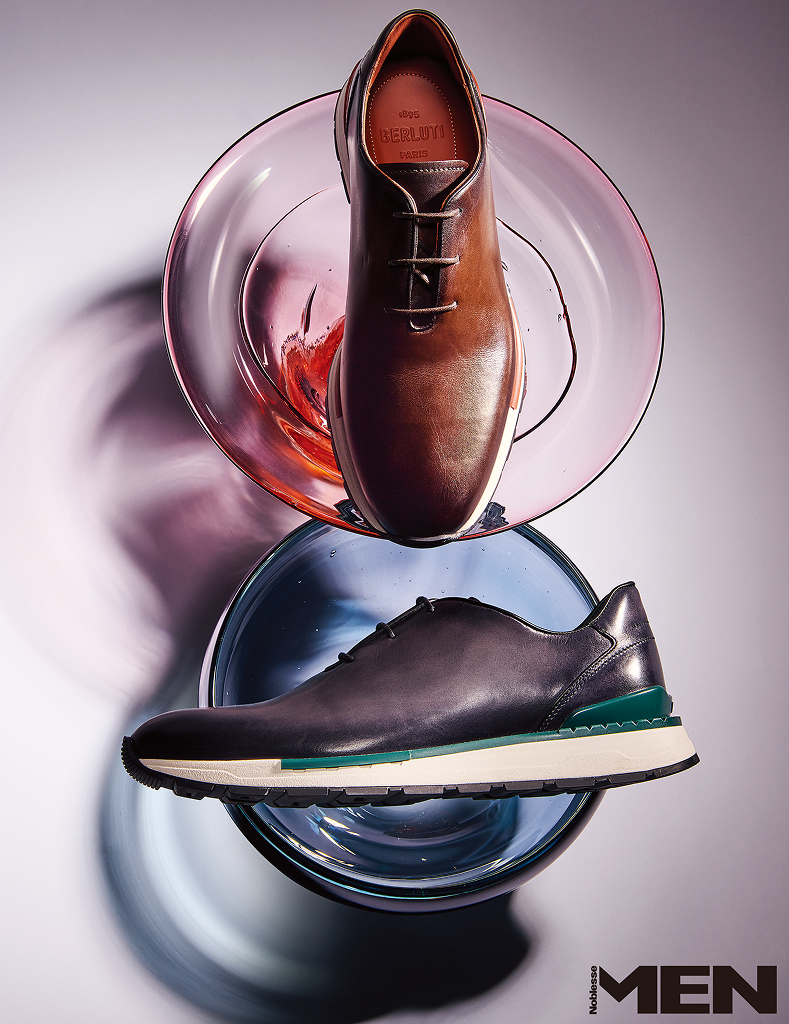 옥스퍼드 형태, 구조적 설계, 레더 물성에 집중했다. 인콜라토 제법을 적용해 어퍼와 솔을 접착 방식으로 결합하는 구조로 바닥을 날렵하게 유지해 전체 실루엣을 정돈한다. 브라운 컬러, 블랙 그러데이션 컬러의 알레산드로 패스트트랙 레이스업 슈즈 모두 Berluti.