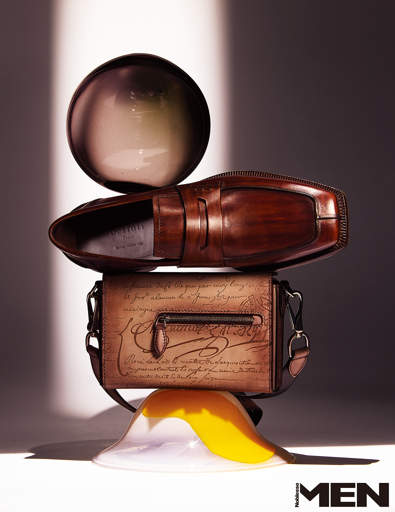 스퀘어 텅과 앞코, 정교한 스티치 디테일로 절제된 감각을 강조한다. 전통적 블레이크 제법을 적용해 착화감이 유연하고 가벼운 몽타보 컬리지 로퍼, 스크리토 패턴으로 일컫는 필기체 문양을 가방 전체에 새긴 원 주르 드 포쉐 메신저백 모두 Berluti.