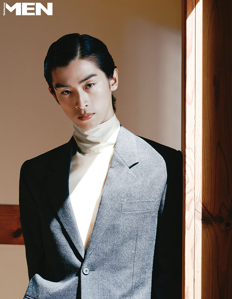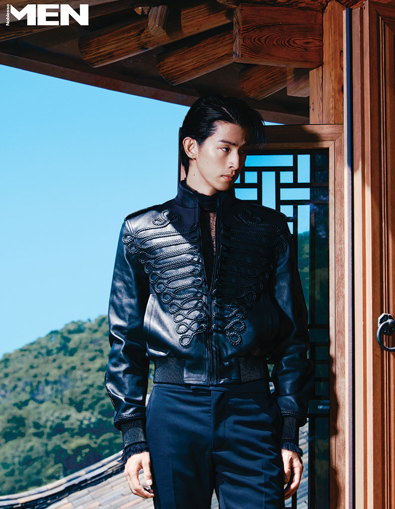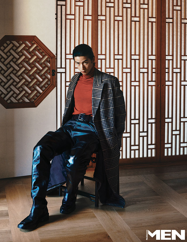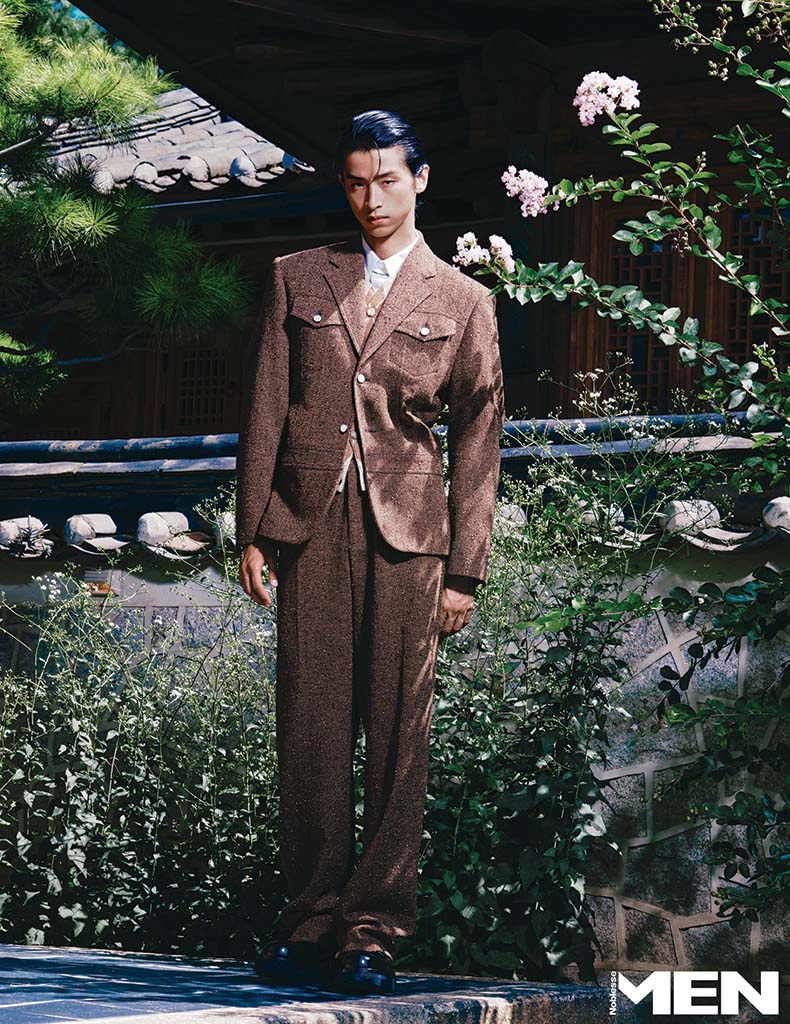 워크웨어 디테일 싱글 재킷과 아가일 패턴 니트 베스트, 브라운 드로스트링 팬츠, 체인 네크리스, 블랙 더비 슈즈 모두 Louis Vuitton, 화이트 셔츠 스타일리스트 소장품.