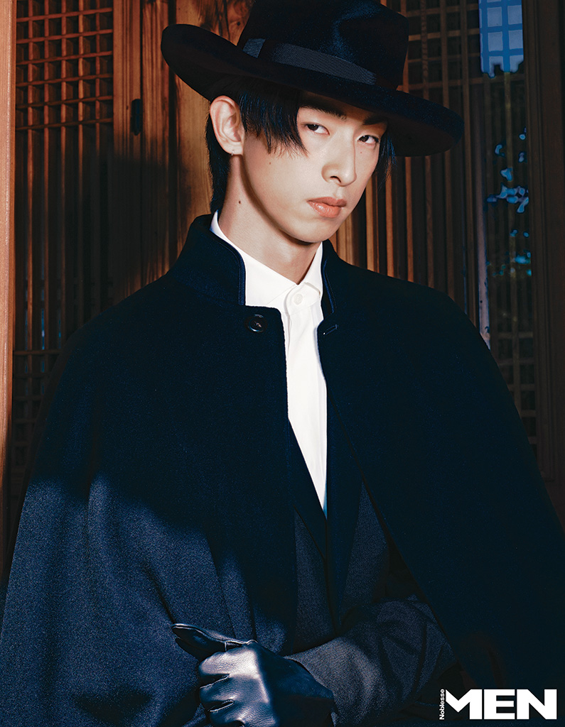 블랙 캐시미어 케이프와 블랙 재킷, 화이트 셔츠, 블랙 페도라, 블랙 레더 글러브 모두 Loro Piana.