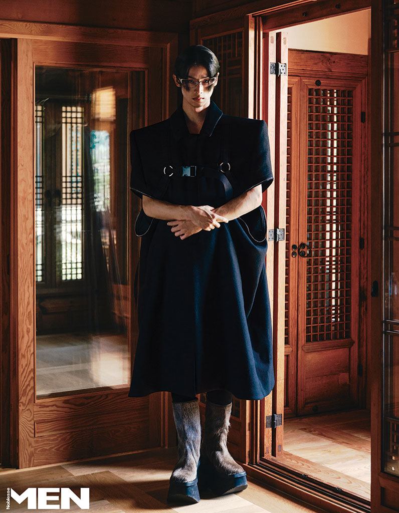 지퍼 디테일 블랙 케이프와 블랙 코튼 레깅스, 페이크 퍼 플랫폼 부츠 모두 Rick Owens, 메탈 프레임 안경 Gentle Monster.