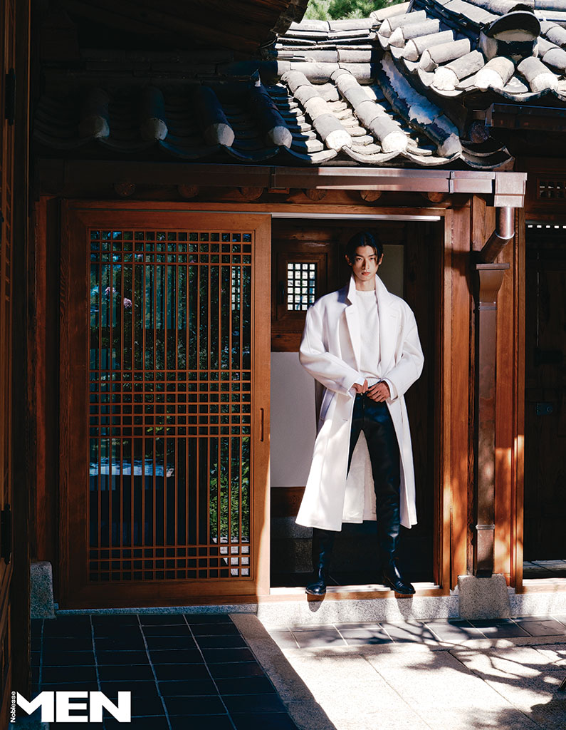 화이트 롱 코트와 화이트 크루넥 니트 스웨터, 블랙 레더 슬림 핏 팬츠 모두 Tom Ford, 블랙 앵클부츠 Jimmy Choo.