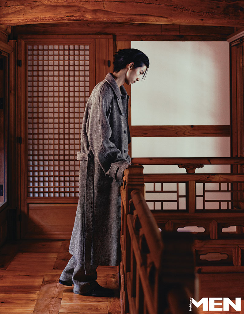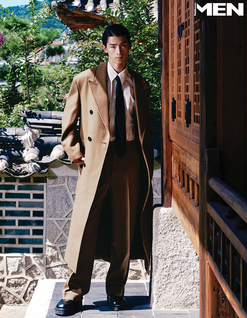 캐멀 컬러 더블브레스트 코트와 아이보리 셔츠, 와이드 팬츠, 블랙 레이스업 슈즈 모두 Ami, 블랙 실크 타이 스타일리스트 소장품.