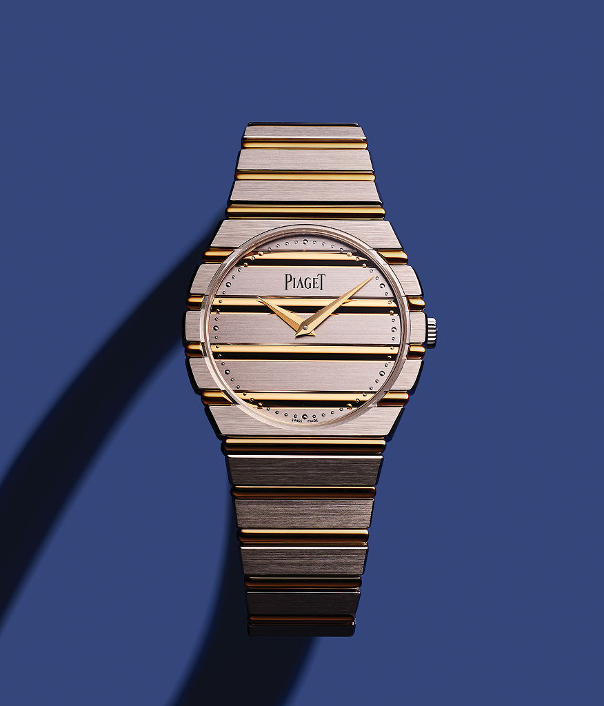 피아제는 1970년대 시계 전반에 금을 적용하고, 실험적 금세공을 통해 시계와 주얼리의 경계를 허물었다. 피아제 폴로79는 1979년에 출시한 피아제 폴로의 원형을 계승한다. 지름 38mm 케이스와 브레이슬릿은 한 몸을 이루고, 화이트 골드와 옐로 골드 거드룬은 금빛 수평선처럼 시각적 쾌감을 안긴다. 두께가 2.35mm에 불과한 울트라 씬 마이크로 로터 무브먼트 1200P1, 한옥의 결구 방식처럼 못이 아닌 이음과 맞춤으로 정교하게 결합한 브레이슬릿 구조는 손목 위에 밀착하며 유려한 금빛의 연속성을 담아낸다.