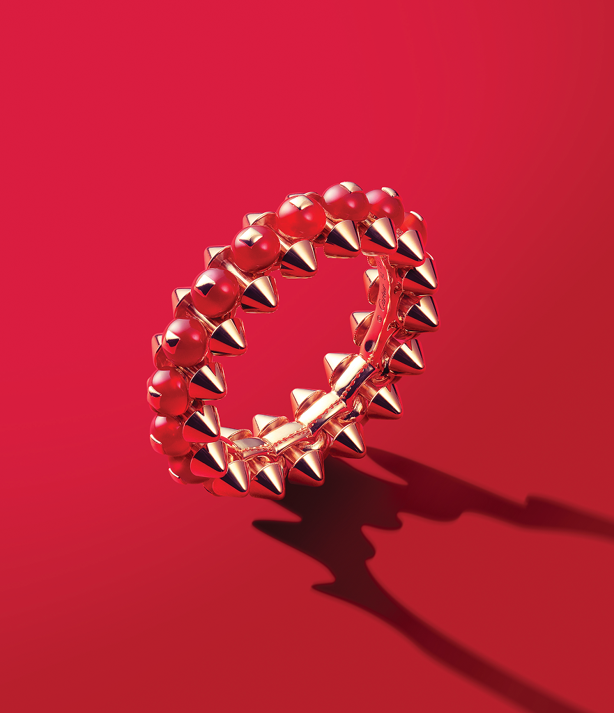 까르띠에 주얼리는 늘 짐작을 넘어선다. 전통적 장인정신을 기반으로 하면서도 기존 문법에 머물지 않는다. 클래쉬 드 까르띠에 링 역시 다르지 않다. 정제된 품격과 대담함, 전통과 반항이라는 상반된 코드를 한데 엮어 분명한 기원과 고유한 성격을 드러내면서도 예상의 범주를 가볍게 비껴간다. 뾰족한 스터드는 날 선 인상을 주지만 유연하게 연결된 구조 덕분에 착용감이 놀랄 만큼 편안하고, 핑크 골드와 조합한 레드 아게이트는 색의 긴장감을 또렷하게 강조한다.