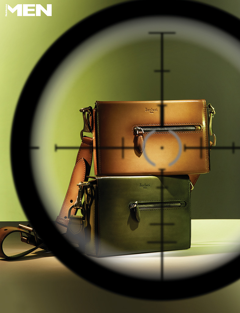 머스터드 & 그린 컬러 원 주르 드 포쉐 백. 견고한 형태에서 신중하고 세련된 분위기가 드러난다. Berluti.
