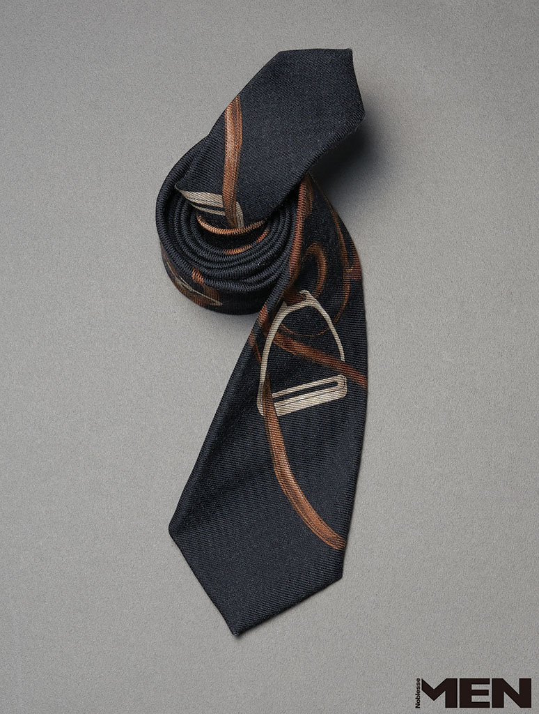 글렌 체크 패턴 재킷 Amiri, 기하학적으로 배열한 사각 패턴 실크 타이 Brioni, 그레이 니트 타이 Dior Men, 컬러 스티치 장식 타이 Herme`s.
