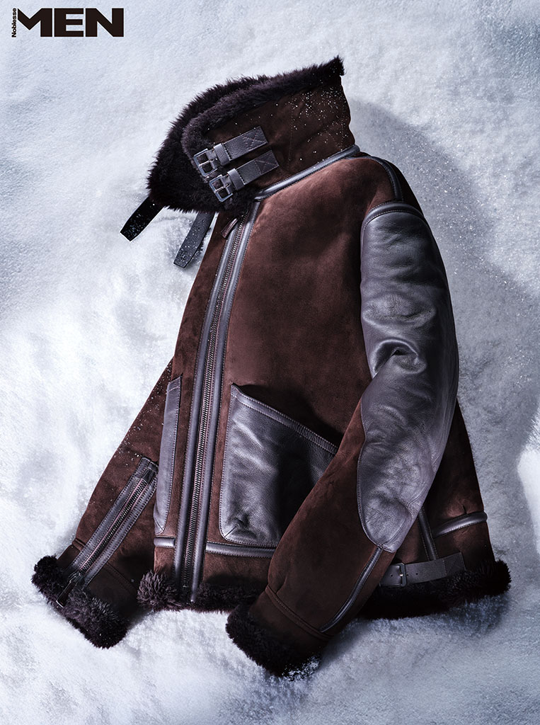 한파에 대항하는 물건 랄프 로렌 퍼플 라벨의 시어링 에이비에이터 재킷. 정신이 번쩍 드는 추위에도 거뜬히 맞설 뿐 아니라 다운재킷의 우아한 대안으로 손색없다. 티셔츠에 가볍게 걸쳐도 위축되지 않을 만큼 포근한 양털 칼라와 버클 스트랩이 바람을 단단히 막아준다. 20세기 파일럿의 방한용 외투에서 차용한 형태지만, 좋은 가죽과 색을 접목해 슈트에 입어도 어색하지 않을 만큼 정중하다.