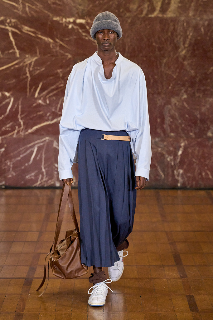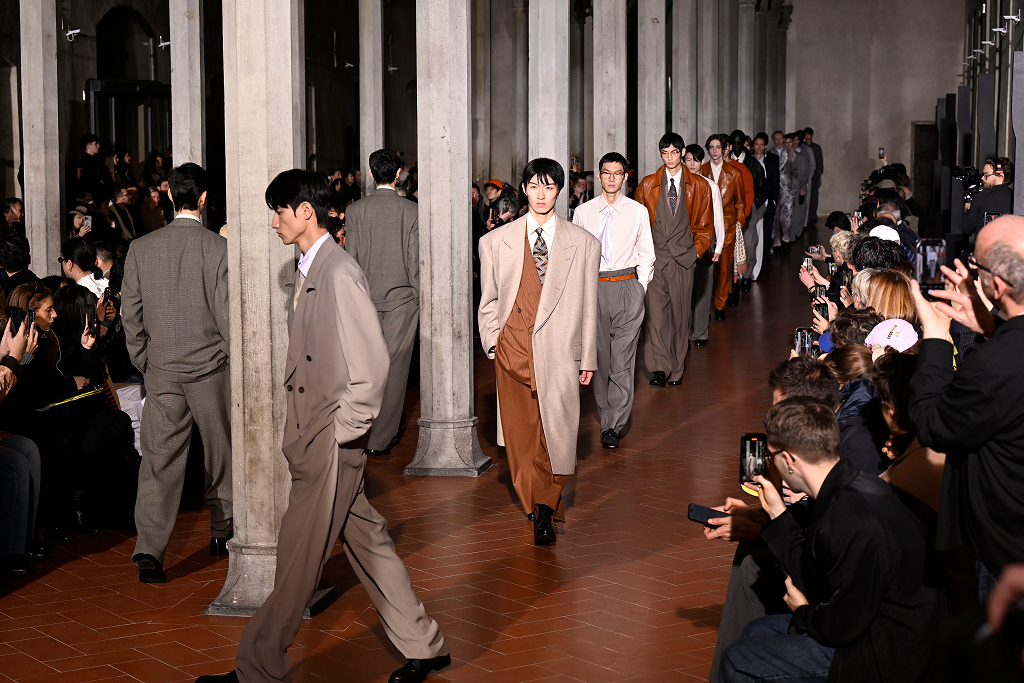 이번 시즌 피티 우오모의 이벤트 중 가장 기대한 것은 LVMH 프라이즈 2025 우승자인 소시 오츠키(Soshi Otsuki)의 쇼다. 이탈리아 피렌체 중심에 위치한 산타 마리아 노벨라 수도원 레페토리오는 소시 오츠키의 유럽 첫 컬렉션 무대가 됐다. 산타 마리아 노벨라 수도원은 대표적 르네상스 양식 성당으로, 도시에서 가장 중요한 유산 중 하나로 손꼽히는 만큼 이곳에서 열린 소시 오츠키의 런웨이는 형언할 수 없는 아름다운 이미지로 각인되었다. 콘크리트처럼 보이는 석재로 마감한 아치형 레페토리오를 배경으로 모델들의 캣워크가 시작됐다. 서정적 선율의 사운드트랙이 공간을 채우자 가슴이 웅장해졌다. 영화음악의 거장 히사이시 조가 참여한, 2000년 개봉 영화 <브라더>의 OST로 만든 음악이었다. 2015년 자신의 이름을 건 브랜드를 시작, LVMH 프라이즈 2025에서 우승한 소시 오츠키는 동시대 남성복의 미래를 이끄는 디자이너로 평가받고 있다. 2026 F/W 컬렉션도 일본의 버블 경제 시대 남성들의 모습을 연상시키는 특유의 실루엣이 반영됐다. 은은한 광택이 흐르는 유연한 소재는 어깨를 강조한 실루엣에 화려함을 배가했다. 이번 컬렉션의 재킷은 어깨가 한층 넓어지고, 바지는 드레이핑을 통해 우아하고 풍성한 실루엣을 연출했다. 여기에 넥타이와 벨트를 활용해 클래식한 남성성을 아름답게 드러냈다. 특히 담배 모양 반지가 룩의 포인트로 많은 이의 눈길을 끌었다.