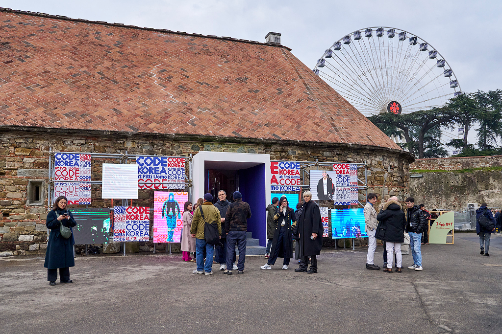 포르테차 다 바소(Fortezza da Basso)에 들어서자 프랑스 건축가 마크 레슐리에(Marc Leschelier)의 ‘고대 유적지/신규 부지(Ancient/New Site)’가 위용을 드러냈다. 높이 5m에 달하는 구조물 18개를 하나의 통합된 형태로 구성해 영국의 스톤헨지를 형상화했다. 이번 박람회를 위해 일시적으로 설치한 이 작품은 단순한 전시를 넘어 관람객이 직접 내부를 들여다볼 수 있는 체험형 공간이라는 점에서 의미를 더한다. 더불어 2026 F/W 시즌 피티 우오모가 지향하는 ‘움직임(Motion)’이라는 테마를 구현했다. 2026 F/W 시즌 피티 우오모는 미래를 향하는 남성복 산업이 어떻게 끊임없이 움직이고 변화하는지 보여준 장이었다. 브루넬로 쿠치넬리, 에르노, 바버, 피콰도르 등 총 758개의 브랜드가 참여했으며, 약 1만2500명의 바이어와 약 1만9000명의 방문객이 다녀갈 정도로 인산인해를 이루었다. 이번 시즌 게스트 디자이너로는 동시대 남성복의 방향성을 제시하는 헤드 메이너와 소시 오츠키가 참여했다. 반가운 소식이라면 작년에 이어 올해도 문화체육관광부와 한국콘텐츠진흥원이 함께한 한국 공동관 ‘코드 코리아’가 각국의 바이어와 손님을 맞이한 일이다. 석운윤(SEOKWOON YOON), 비건타이거(VEGAN TIGER), 아조바이아조(AJOBYAJO), 비엘알(BLR), 이지앤아트(EGNARTS), 오디너리피플(ORDINARY PEOPLE) 등 각 브랜드의 독창적 개성이 느껴졌고, 부스를 찾는 이들에게 K-패션의 경쟁력을 각인시키는 뜻깊은 기회를 마련했다.