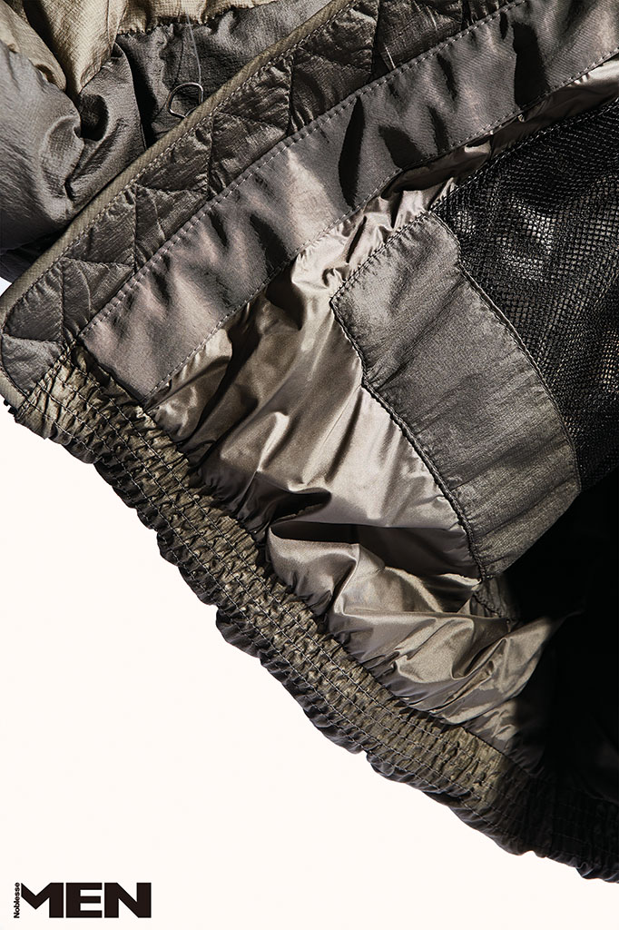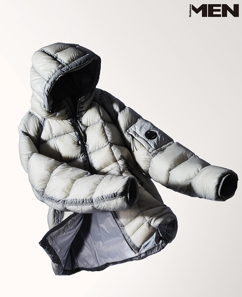 혁신적 소재와 기능의 융합을 꾀하는 C.P. 컴퍼니의 후드 다운재킷. 데니어는 섬유의 굵기를 나타내는 단위로 숫자가 낮을수록 가는 실을 사용했다는 뜻이다. 보편적으로 일반 아우터웨어에는 20~40데니어를 사용하는 데 반해 이 재킷은 초경량 7데니어 나일론 립스톱 소재를 적용했다. 무게감이 느껴지지 않을 만큼 가볍고 부드럽다는 의미. 여기에 충전재를 직접 주입하는 방식을 활용해 봉제선을 최소화하면서 충전재가 한쪽으로 치우치는 문제를 해결했다.