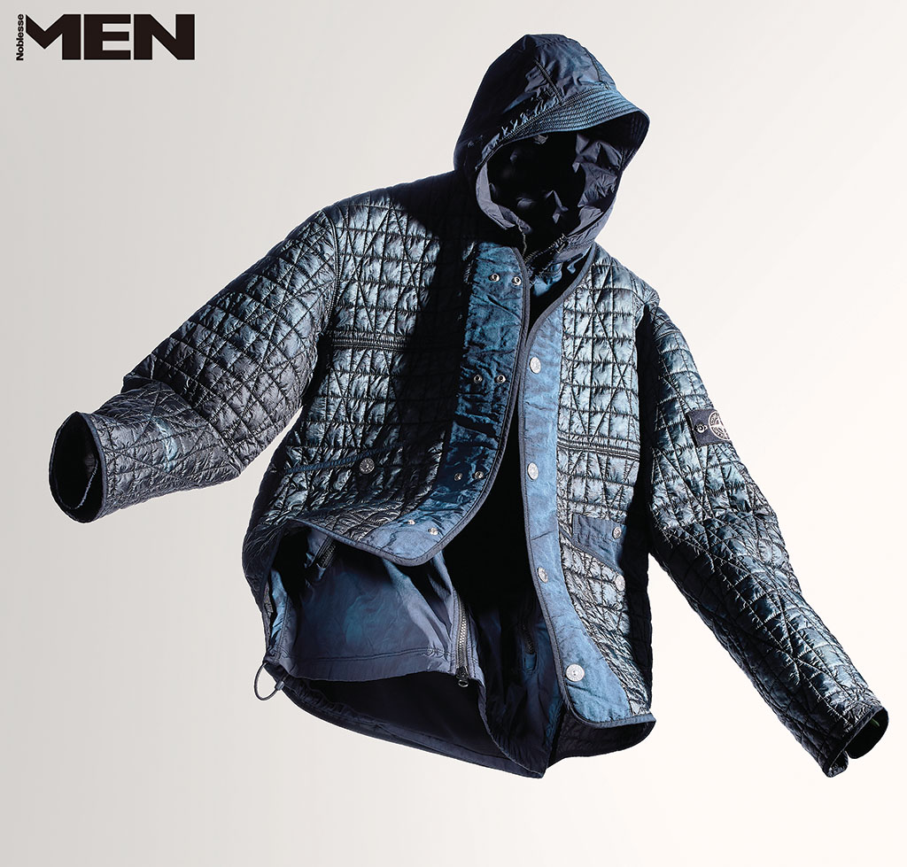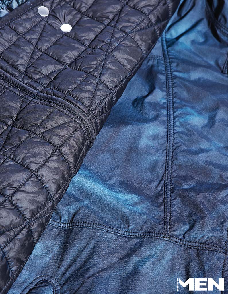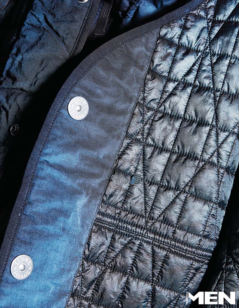 실험적 텍스타일 연구와 기능이 중심이 되는 디자인 철학을 계승하는 스톤 아일랜드는 소재 개발의 혁신을 선도한다. 두 겹을 겹쳐 입는 재킷도 그들의 혁신적 신소재를 활용한 것. 방풍, 방수, 그리고 염색 안정성을 극대화하기 위해 개발한 나일론 렙스 소재에 가먼트 다이 염색 과정과 부식 가공으로 마모된 듯한 표면을 구현한 방식은 일본식 인디고 수공 염색에서 영감받았다. 불균일한 색조는 각 제품마다 다르게 적용된다.