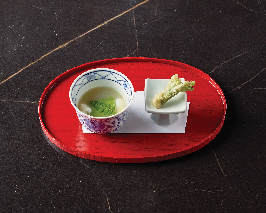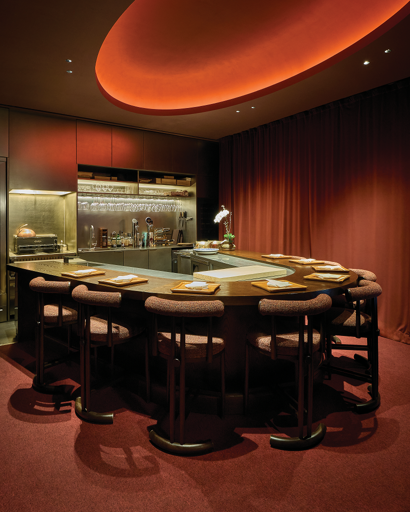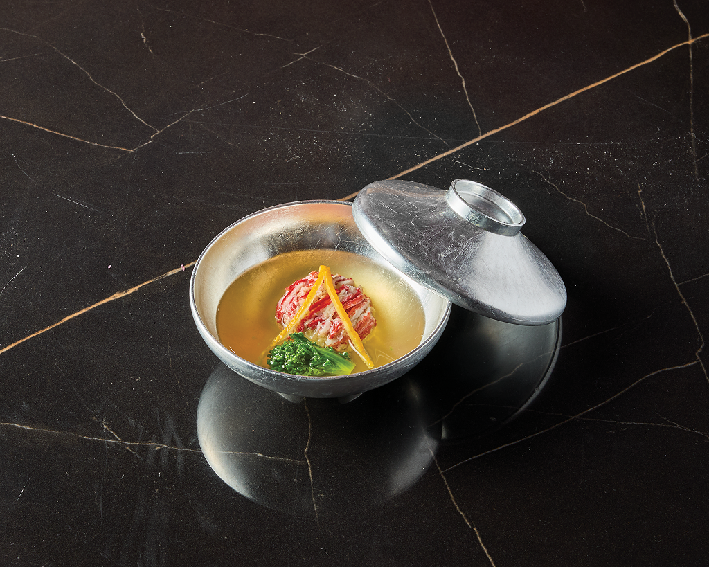 최근 대중에게 사랑받고 있는 넷플릭스 프로그램 <흑백요리사: 요리 계급 전쟁 시즌2>에서 ‘칼마카세’로 강렬한 인상을 남긴 신현도 셰프의 오마카세 레스토랑 모노로그가 하우스오브신세계 청담에 문을 열었다. 1층 와인 숍 안쪽에 자리한 프라이빗한 공간은 붉은 조명과 어두운 톤 인테리어로 연극 무대를 연상시키며, ‘모노로그’라는 이름처럼 오마카세를 셰프의 연출로 완성하는 하나의 서사로 풀어낸다. 코스는 두 달마다 바뀌는데, 매 시즌 하나의 단어를 중심으로 이야기를 전개한다. 최근 코스의 키워드는 ‘조개’. 쑥 바지락 요리는 도다리쑥국을 현대적으로 재해석해 쑥 향을 머금은 두부와 맑은 조개 육수, 두릅튀김으로 계절의 변화를 섬세하게 연출한다. 가리비 요리는 조개 속에서 진주를 발견하는 순간에서 착안해 관자살과 전복, 제철 채소에 금귤과 딸기를 더해 화사한 색감을 완성한다. 코스 후반에 등장하는 대게 유자는 대게 껍질로 우려낸 깊은 육수에 게살 어묵과 유채 봉오리를 올려 봄의 여운을 길게 남긴다.