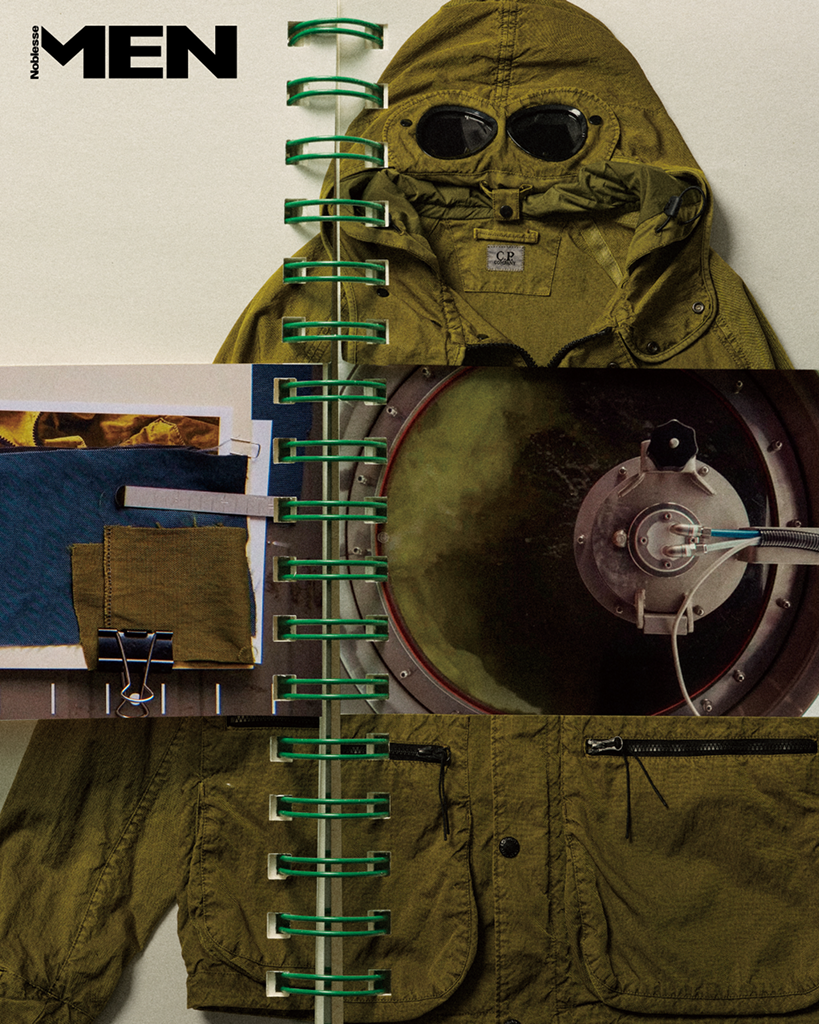 C.P. 컴퍼니는 2023년부터 SEED 프로젝트를 통해 의류 생산과정에서 발생하는 환경 영향을 줄이기 위한 연구 프로그램을 진행해왔다. 순환 생산, 지역 기반 소재를 주로 실험하며 쐐기풀이나 헴프 같은 식물성 섬유를 면과 혼합하거나 자연에서 빠르게 재생되는 소재의 가능성을 탐색한다. 브랜드 특유의 가먼트 다잉 기술 역시 이러한 소재 연구와 맞물려 발전해왔다. 원단 상태에서 염색하는 것이 아닌, 완성된 의류를 염색하는 방식은 공정을 단순화해 자원 낭비를 줄이고 다양한 섬유 혼합 소재를 유연하게 활용할 수 있게 한다. 재생 나일론 원사로 제작한 옥스퍼드 원단 Panama-R 소재의 고글 재킷.