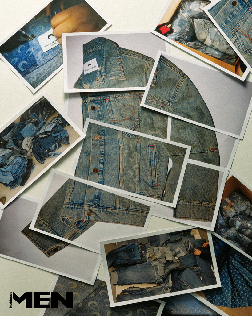 디자이너 마린 세르는 스스로를 ‘에코퓨처리스트(Eco-futurist)’라 정의하며, 빈티지 의류와 데드 스톡 원단, 재활용 섬유를 해체하고 재구성하는 업사이클링을 브랜드의 핵심 제작 방식으로 삼았다. 대표적 예가 데님 라인이다. 버려진 데님 의류를 해체한 뒤 서로 다른 워싱과 질감의 원단을 이어 붙이고 그 위에 브랜드의 상징인 초승달 패턴을 더해 새로운 시그너처 아이템으로 변모시킨 것. 동시대적이며 창의적인 마린 세르의 컬렉션은 업사이클링을 윤리적 선택에 머무르게 하지 않으며, 기꺼이 즐기고 싶게끔 유도한다. 감각적인 이 업사이클링의 세계는 마린 세르 유튜브를 통해 더욱 생생하게 들여다볼 수 있다. 문 레이저 데님 트러커 재킷.