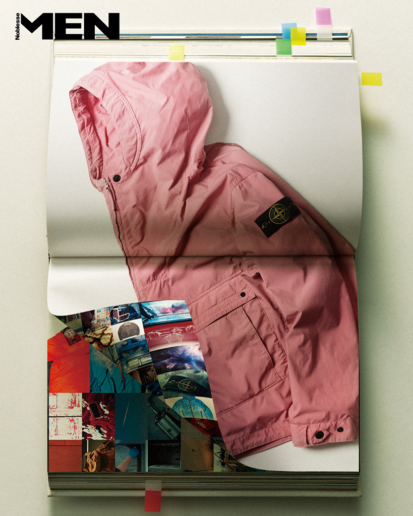 스톤 아일랜드는 생산과정에서 발생한 원단 폐기물을 섬유로 재가공해 의류로 제작하는 순환 시스템을 갖췄다. 제작 공정에서 남은 원단을 분쇄해 재방적한 직물은 독특한 질감과 색감을 지니며 디자인 요소로 사용되기도 한다. 또 ECONYLⓇ 섬유를 활용한 소재 연구에 가먼트 다잉 기술을 결합해 지속 가능한 텍스타일 개발을 이어간다. 브랜드가 개발한 다양한 소재 중 하나인 파나마 틴토 테라는 생산과정에서 발생한 자투리 천을 재활용한 라인이다. 최소 50% 이상 재활용 소재를 혼합한 원사에 과불화화합물(PFC)을 포함하지 않은 천연 광물성 염료로 염색한다. 이러한 연구 과정은 브랜드가 2024년에 선보인 다큐멘터리영화 <Infinite Colours>에서 더 자세히 확인할 수 있다. 나일론 소재의 후드 재킷.