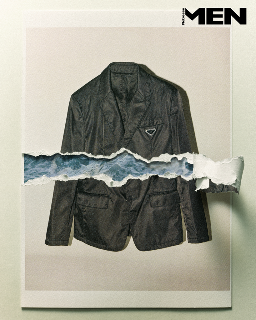 2019년에 시작된 프라다의 ‘Re-Nylon’ 프로젝트는 바다에서 수거한 플라스틱과 폐어망, 산업용 섬유 폐기물을 재생 나일론 ‘ECONYLⓇ’로 전환한다. 탈중합과 재중합 과정을 거쳐 끊임없이 재활용할 수 있는 나일론으로 환경 부담을 현저히 줄이는 순환 구조를 구축한다. 동시에 내셔널지오그래픽 소사이어티와 협업한 다큐멘터리 시리즈를 통해 해양 오염 문제를 조명하고, 유네스코 정부간해양학위원회(IOC)와 함께 ‘SEA BEYOND’ 프로그램을 전개하며 해양 생태계 교육과 보존 활동을 병행하고 있다. 리나일론 소재 싱글브레스트 재킷.