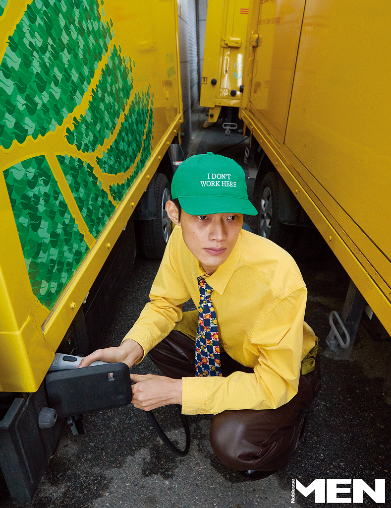 옐로 코튼 셔츠와 브라운 레더 팬츠 모두 Ferragamo, 플라워 패턴 타이 Bell & Nouveau, 그린 볼캡 에디터 소장품.