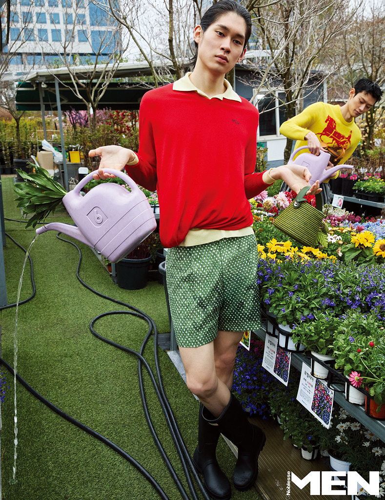 진희 _ 레드 스웨터와 옐로 폴로 스웨터, 워터링 캔 백, 체리 백참 모두 Loewe, 그린 쇼츠 Zegna, 레인 부츠 Hunter. 호용 _ 옐로 니트 스웨터 Celine, 스트라이프 쇼츠 Versace, 모노그램 장식 워터링 캔 백 Louis Vuitton