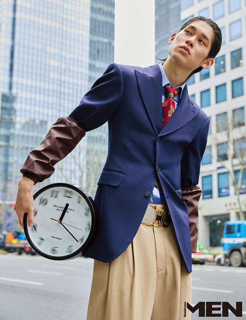 네이비 싱글 재킷과 블루 셔츠, 베이지 와이드 팬츠, 멀티 참 벨트 모두 Celine, 지오메트리 패턴 타이 Bell & Nouveau, 벽시계 Yellow Hippies, 팔 토시 에디터 소장품.