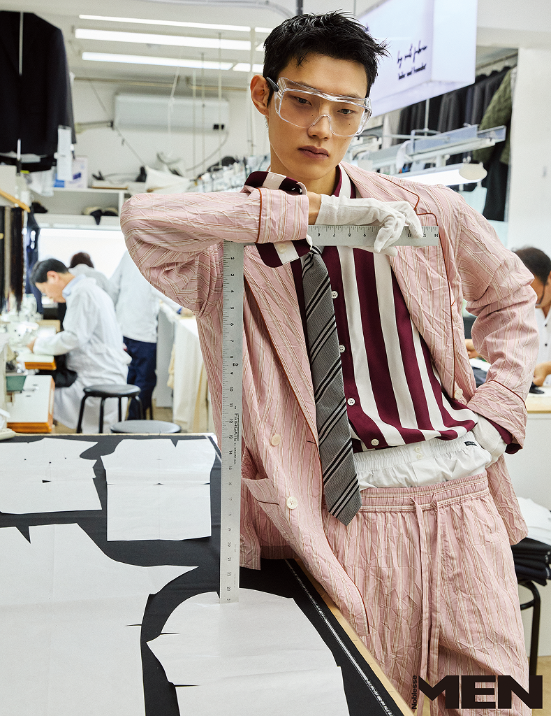 호용 _ 더블브레스트 리넨 슈트와 스트라이프 셔츠, 복서 브리프, 그레이 타이 모두 Dolce&Gabbana, 고글과 흰 장갑 모두 에디터 소장품.