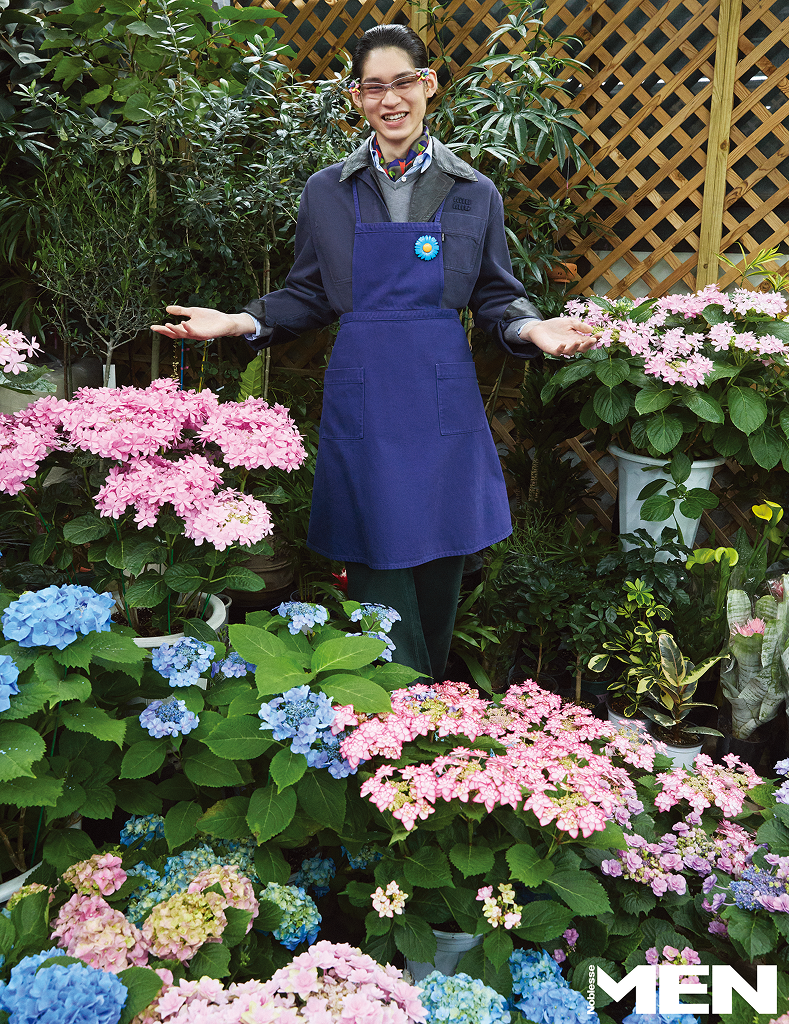 개버딘 앞치마와 레더 칼라 워크 재킷, 그레이 스웨터, 포플린 셔츠, 지오메트리 패턴 실크 스카프, 그린 팬츠 모두 Miu Miu, 비즈 장식 템플 안경 Gentle Monster, 꽃 브로치 Bell & Nouveau.