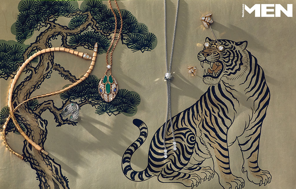 왼쪽부터 _ 지혜와 생명력, 풍요와 다산을 상징하는 뱀의 유려한 라인을 차용한 로즈 골드 세르펜티 네크리스, 2개의 뱀 머리 모티브에 다이아몬드를 파베 세팅하고 관능적인 뱀의 눈빛을 에메랄드로 표현한 세르펜티 링, 말라카이트와 다이아몬드를 파베 세팅하고 블루 사파이어로 눈을 장식해 뱀 형상을 사실적으로 구현한 세르펜티 세두토리 네크리스 모두 Bvlgari. 권위와 힘, 행운, 번영의 의미를 품은 벌과 허니콤 모티브를 활용한 화이트 골드 비 드 쇼메 펜던트 네크리스, 한쪽은 육각형 다이아몬드를 장식하고 다른 쪽은 옐로 골드 벌 모티브를 적용한 비 드 쇼메 이어링, 다양한 크기의 다이아몬드를 세공한 옐로 골드 비 드 쇼메 브로치 모두 Chaumet.
