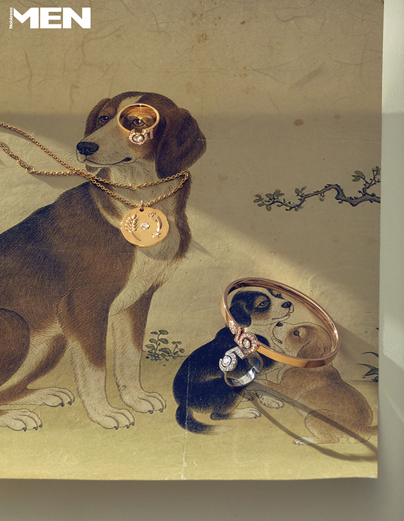 위부터 _ 18K 옐로 골드와 다이아몬드로 제작한 이터널 N°5 링, 번영과 풍요, 행운을 상징하는 밀 이삭과 꿈과 희망을 품은 꼬메뜨, 영원히 사라지지 않는 매력을 상징하는 숫자 5 모티브를 메달 안에 가득 채운 18K 옐로 골드 샹스 드 샤넬 메달, 18K 화이트 골드에 다이아몬드를 장식한 이터널 N°5 링, 샤넬 고유의 18K 베이지 골드와 다이아몬드가 조화로운 N°5 브레이슬릿 모두 Chanel.