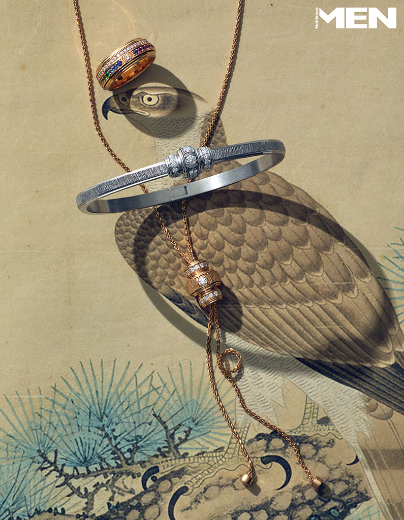 위부터 _ 영원한 순간과 행운의 의미를 지닌 회전하는 링에 다이아몬드・사파이어・루비로 다채로운 빛의 향연을 완성한 로즈 골드 포제션 링, 데코 팰리스 마감 기법을 적용한 화이트 골드 포제션 브레이슬릿,